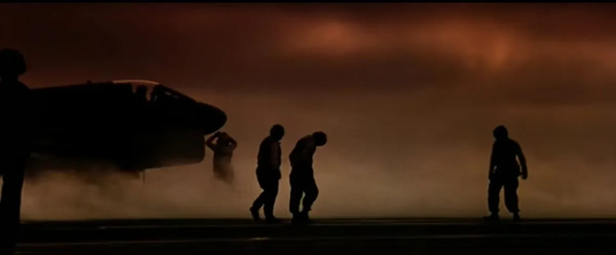 1) 일단, 어렸을 때의 기억으로는 남아 있는 것이 수많은 F-14 톰 캣 함대기를 띄우기 전의 항공모함 갑판에서 연기가 낀 채로 분주히 전투기와 전투기 조종사, 엔지니어 등등이 갖가지 제스처를 마치 춤이라도 추는 것처럼 보여주는 장면이었다. 이 장면은 초반에 제목과 더불어 주요 스태프와 연기자의 이름이 나오는 중에 종소리가 계속 반복되는 OST와 더불어 웅장하게 나오는데, 기억 속 내용보다 훨씬 더 스케일이 컸다.