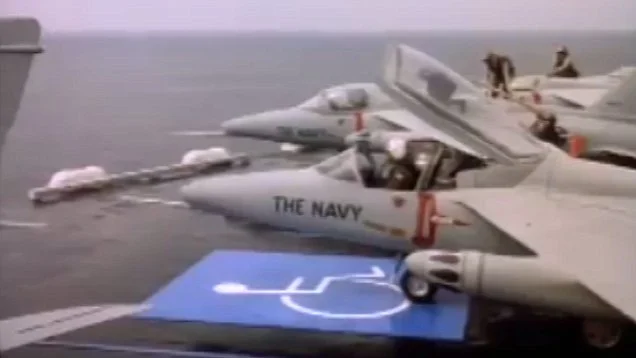 하나하나의 함대기를 띄워 올리고 다시 착륙을 시키기 위해서 많은 이들이 분주하게 움직이고, 거대한 스케일의 항공모함의 위용을 느끼게 하는 동시에 강력한 미국의 해군 소속 항공 부대의 스케일과 디테일을 동시에 보여주고 있는, 압도적인 느낌을 주는 그 장면을 굉장히 잘 비틀어서 웃음거리로 만들었기 때문에 바람이 빠져나오듯이 웃음이 절로 났던 것이다. 그 격차가 엄청났다는 사실을 다시 깨달았다.