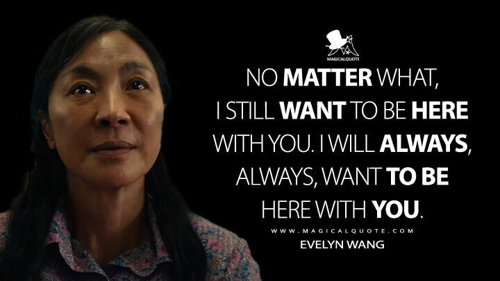 8. "에블린"은 자신이 처한 현실보다 더 나은 자신의 모습이 될 수 있는 무술 액션 배우로서 출세한 세계가 있다는 사실에 광분하고 지금으로부터 벗어나 그 세계에 사는 것이 더 나을 수 있다는 생각에도 사로잡히지만 그 세계에서 만난 자신이 결혼하기를 포기했던 "웨이먼드"가 그 세계에서 또한 능력을 인정받고 훨씬 더 멋진 중년의 남자로 살아가고 있음에도 불구하고, "에블린"과 함께 살아갈 수 있었다면 좁은 아파트에 지지고 볶는 삶을 살게 되었더라도 더 행복했을 것이었다는 말을 남길 때에야 비로소 능력 없는 호구형 남편 "웨이먼드"와 만들어온 삶의 소중함을 깨닫게 된다.