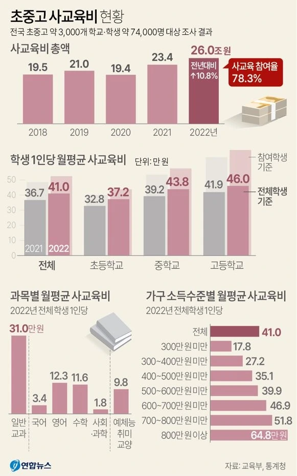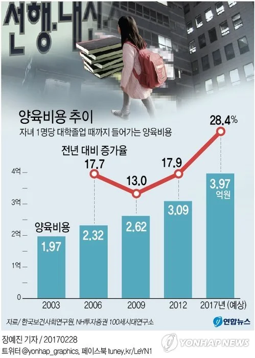 상대적 경쟁에서 우위나 최소한 동등한 경쟁력을 유지하려고 여기저기에서 사정없이 쓰다 보니 물가 상승률을 홋가하는 사교육비 상승률을 경신하는 사회는 낳으면 낳는 대로 더 힘들어지는 가계 살림을 떠올리지 않을 수 없게 만든다.