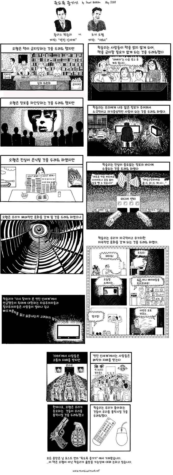 아래의 한국일보 기사를 보면 그 비교가 제대로 나와 있으며, 이렇게만 보면 꼭 "올더스 헉슬리"가 시대를 앞서서 엄청난 혜안을 가진 천재이자 현자처럼 느껴질 정도다.