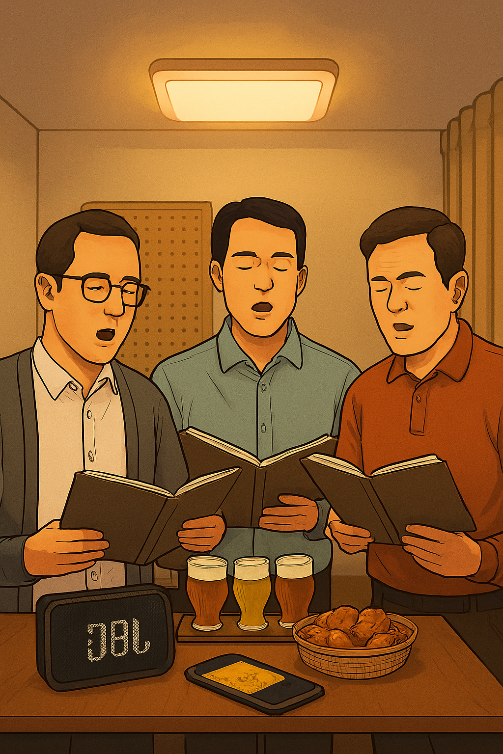 여유 있게 햄버거 세트를 말끔하게 다 처리하고 약간 늦게 연습장에 들어섰을 때, 막 들어서는 베이스 파트장님과 합류했다. 이렇게 삼인이 연습실로 들어가 JBL의 블루투스 스피커에 내 아이폰을 연결하고, 연습곡 중에 4곡의 음원을 베이스 버전 각곡별 2번씩, 합창 버전 각곡별 1번씩, 마치 실내 체육관에서 각각의 근육을 위한 1세트씩의 잘 짜인 운동을 하는 것처럼 튼 뒤에 악보를 보며 부르며 보강했다.