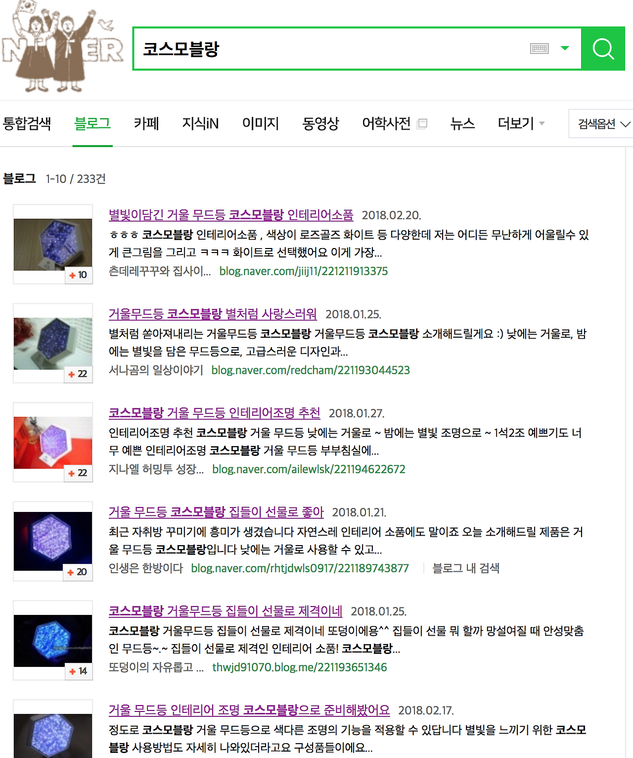 체험단의 경우 블로그 상위 노출이 되지 않는 이상 의미가 없으므로, 상위 노출이 될 수 있는 블로거 위주로 선택을 해야한다. ( 물론 키워드 또한 정말 중요하다. 블로거들에게 우리는 거울 무드등, 집들이 선물, 인테리어 조명 가은 키워드를 전달하여 진행했다. ) 그리고 블로그의 포스팅들은 결국 구매자가 구매를 선택하게 되는 중요한 요인 중 하나이므로 실제로 판매가 시작되기 전에 미리 작업을 해놓는 것이 바람직하다고 할 수 있다.