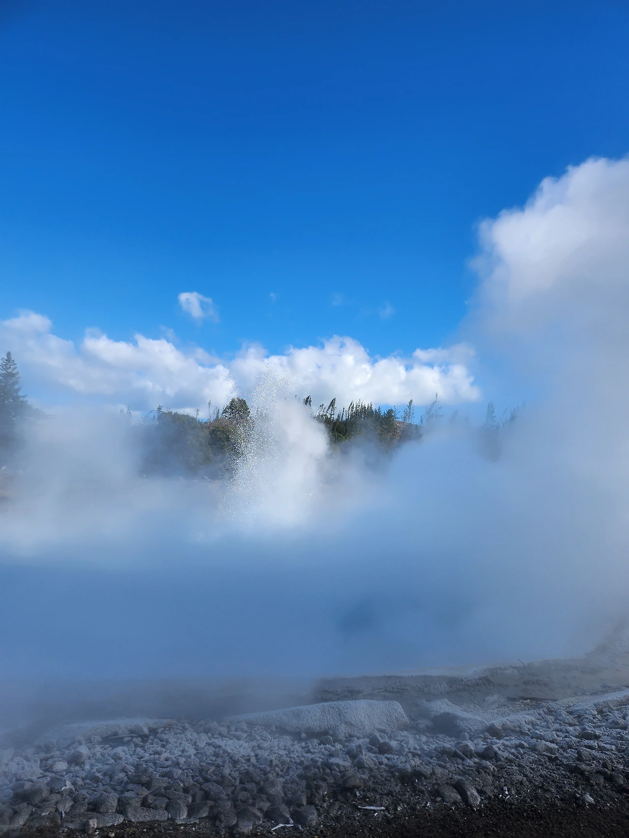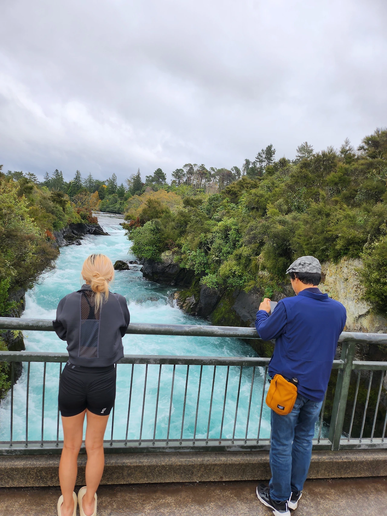 약 한 시간 30분을 달려 후카폭포에 왔다. 호수의 물은 폭포수다. 타우포호수에서 시작하여 와이카토강의 좁은 협곡으로 떨어진다. 강물이 협곡사이에서 힘을 받아 떨어지는 장면은 장관이다. 하얀 얼음이 부서지듯이 일시에 흘러내리는 순간은 "우와" ice-blue! snow-white! 였다.