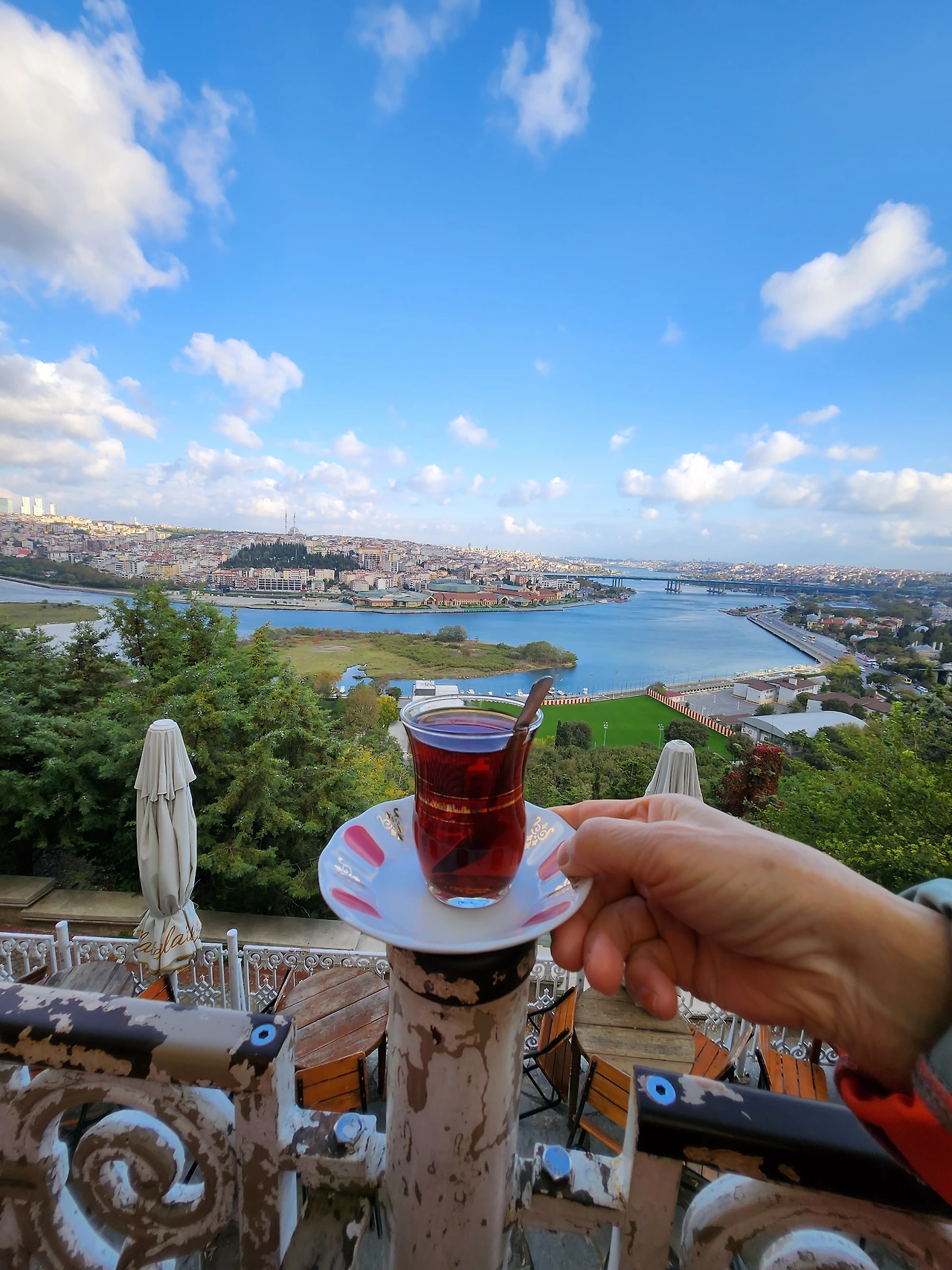 차이 한잔을 앞에 두고 언덕아래 흐르는 금각만을 바라본다.수면에 비치는 석양이 금빛으로 빛나 금각만(Goiden Horn)'이라 불린 만큼 한눈에 내려다볼 수 있는 아름다운 곳이다.