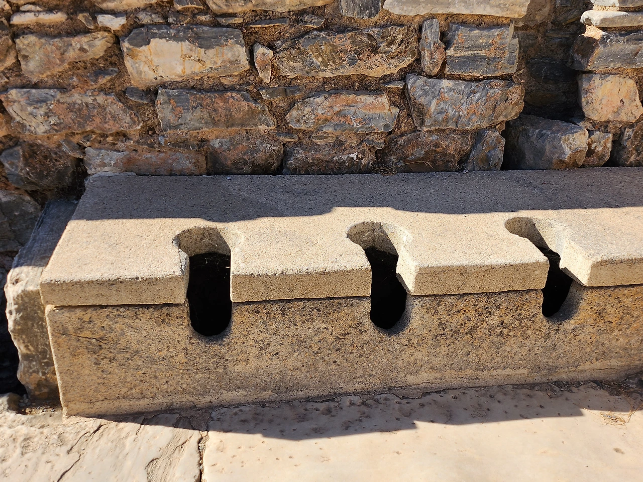 당시의 공중화장실도 보인다. 화장실이 수세식이라니! 놀라운 점은 50명이 동시에 사용하였는지 칸막이도 없이 줄줄이 만들어져 있다. 위생상 손으로 처리를 했는지 화장실 앞에 손을 씻을 수 있는 연못터까지 있다.