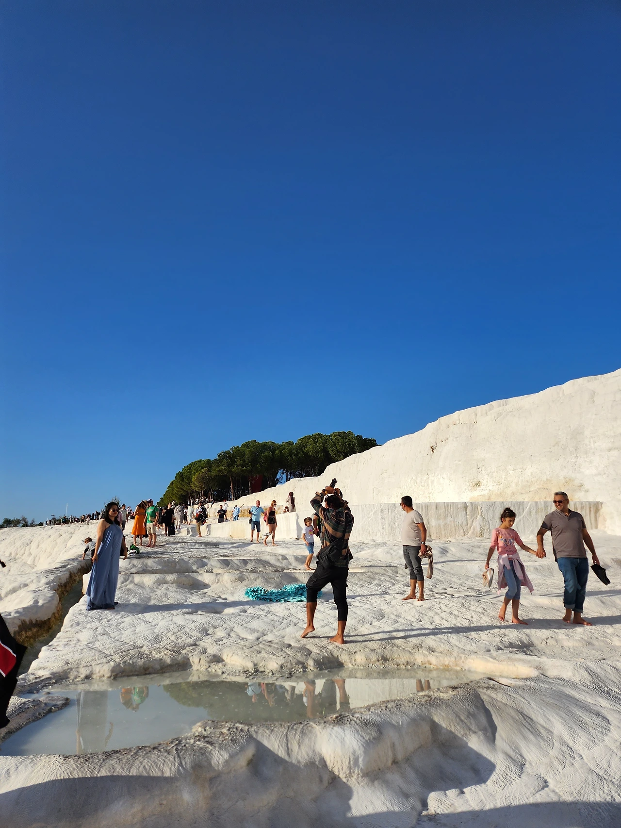 파묵칼레! 6년만에 만난 그리운 빛의 향연은 몇개의 쟁반에만 사람들이 가득하다. 갈수기인지 말라 있는 곳이 많아 하얀 석회석 세상이나마 만족한다. 하늘닮은 물빛이 탄산칼슘이 만든 석회암 둥근 접시에 차고 넘쳤는데 아쉽다. 온천수 대부분을 호텔 수영장으로 끌어가는 바람에 석회붕도 황폐화되고 있다니! 정부의 정책이 아쉽다. 입구에서 신발대신 맨발걷기로 접근하게 되어 있는것 만은 잘한 것 같다. 수영복 입고 수영대신 포즈를 취하는 사람, 천사날개를 빌려 사진찍는 사람, 유럽인과 아시아인, 아프리카인 등 다양한 언어가 들리는 이곳이 파라다이스인양 하나같이 환하게 웃는다. 신발을 비닐봉지에 담고 조심조심 발바닥의 촉감을 느껴본다. 하얀 석회수가 발가락을 간지럽힌다. 석회층과 그 위로 흐르는 온천수가 햇살을 받아 눈부시게 아름다운 빛으로 빛난다. 커다란 쟁반은 한 번쯤 들어오고 싶어 하는 사람들로 넘친다.