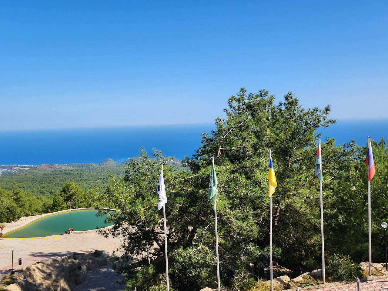 산맥은 공룡의 등뼈처럼 굽이굽이 이어져서 지중해와 만난다. 올라오길 잘했다. 내 남은 생애에 이런 풍경을 얼마나 더 볼 수 있을지? 오늘을 살아있는 날의 마지막 날인 것처럼 눈가득 담고 마음껏 새겨야겠다. 좋은 풍경을 보기 위해서는 날씨가 도와주지 않으면 오를 수도 없고 볼 수도 없다. 산 정상의 만년설과 푸른 하늘은 참으로 곱고 예쁘다. 멋진 하늘을 배경으로 튀르키예 국기가 펄럭인다.