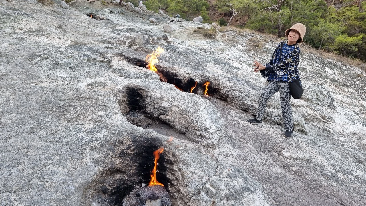 튀르키예인들이 믿고 있는 그리스 신화에 나오는 키메라! 머리는 사자, 몸은 염소, 꼬리는 뱀의 형상을 한 괴물로 입에서 불을 뽑는다고 한다. 신화에 의하면 영웅 벨로로폰이 날개 달린 말 페가수스를 타고 가서 키메라를 죽였을 때 키메라의 피가 땅에 떨어져 불꽃이 되었단다. 산기슭 바위틈 여러 군데에서 불꽃이 올라오는데, 수천 년간 한 번도 꺼지지 않았다고 한다. 바람이 아무리 불어도, 비가 내려도 불꽃은 꺼지지 않는데. 이 일대가 화산지대가 아니라 석회암지대라니 신기하긴 신기하다. 영원불멸의 불꽃을 보니 이곳이 올림푸스산이라고 믿어야겠다. 신들이 바위틈에서 불씨를 안고 여전히 불로장생하고 있는 느낌이다.