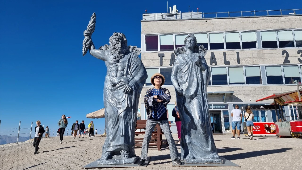 상부승차장 입구에 대장장이의 신인 헤파이토스 및 아프로디테의 플라스틱상이 서 있다. 불꽃의 화신 헤파이토스는 태어나자마자 불꽃을 휘날리고 빛을 내뿜으므로 그의 어머니 헤라가 헤파이토스를 올림포스산으로 추방하였는데, 추방당한 헤파이토스는 미의 여신이 되는 '아프로디테'와 결혼하여 이곳 올림포스산에서 살았다고 한다. 신들을 배경으로 사진 한 장을 남긴다. 신들의 상 앞에는 관광객용 스릴만점의 하늘그네가 있다. 호객을 위해 건장한 청년이 열심히 흔들거리며 타고 있는데 감히 무서워서 용기를 낼 수가 없다.