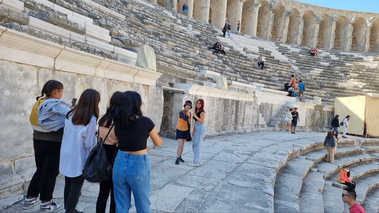 다음날 우리는 안탈리아 시내에서 차로 약 30분 거리에 있는 아스펜도스로 향했다. 유적지는 튀르키예의 마추픽추라고 할 정도로 유명하다. 원형극장은 규모가 만 오천 석 정도를 수용할 정도로 컸다. 극장 안으로 들어가니 원형 그대로 유지되어 관람석의 대리석 의자 몇 개가 교체된 흔적 말고는 흠잡을 데가 없을 정도였다. 무대에서 지금도 공연이 열린다니 놀라웠다. 계단을 따라 한층 한층 올라가며 극장 아래를 내려다보니 까마득하다. 맨 꼭대기에서 무대를 바라봐도 한눈에 다 들어올 정도로 객석의 위치들이 잘 만들어졌다. 곳곳에는 소풍온 소녀들만이 융성했던 때의 무대감각보다 사진각을 잡느라 이쪽저쪽으로 움직이며 배경으로 삼고 있다. 청춘들의 밝은 미소 안으로 들어가서 손하트도 가르쳐 주니 너무나 좋아한다. 언어는 통하지 않지만 같은 공간에서 여행의 들뜬 마음은 통하니 즐겁다.