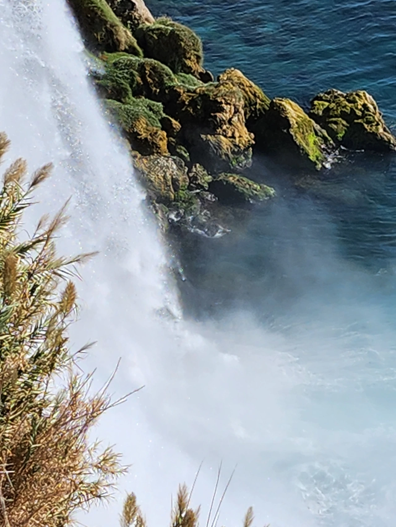 뒤덴폭포는 도심의 주택단지와 공원 근처에 위치해 있었다. 보통 폭포는 산의 계곡 근처일 거라는 추측과 달라서 지도를 몇 번이고 확인하였다. 드디어 공원 끝에 오니 평지에서 떨어지는 폭포수는 황홀하리만큼 화사한 햇살에 반사되어 무지개까지 연출되어 감탄하고 말았다. 안탈리아 올림푸스산에서 흘러내리는 물줄기는 긴 여정의 끝에서 거칠게 사나워지더니 거대한 물줄기로 합하여 지중해로 떨어져 내린다. 고요한 지중해는 성질 사나운 물줄기를 어미의 마음이 되어 잔잔한 바다가 되어주니 하늘빛과 합한 바다는 눈부시게 아름다울 수밖에.