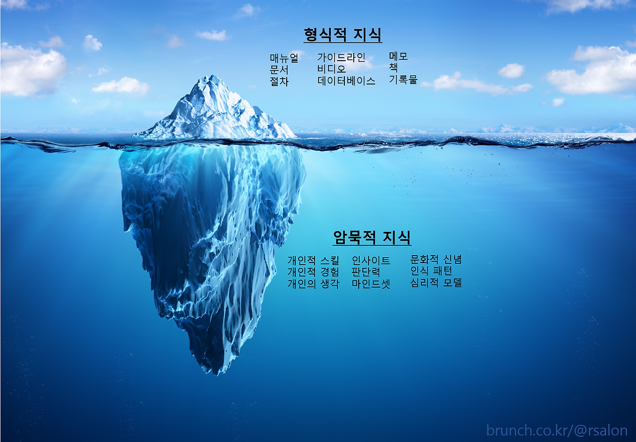 즉, 물에 잠겨 보이지 않는 빙하의 아랫부분은 ‘암묵지’, 빙하의 윗부분은 '형식지'라고 할 수 있다. 앞서 언급한 마이클 폴라니는 1958년에 발행한 책 <개인적 지식>에서 암묵적 지식은 공유되기 어려운 노하우이자 드러나지 않는 지식으로 “우리는 말할 수 있는 것 이상을 알고 있다”라고 언급했다. (출처 : 네이버 백과사전)