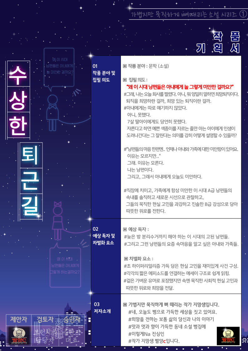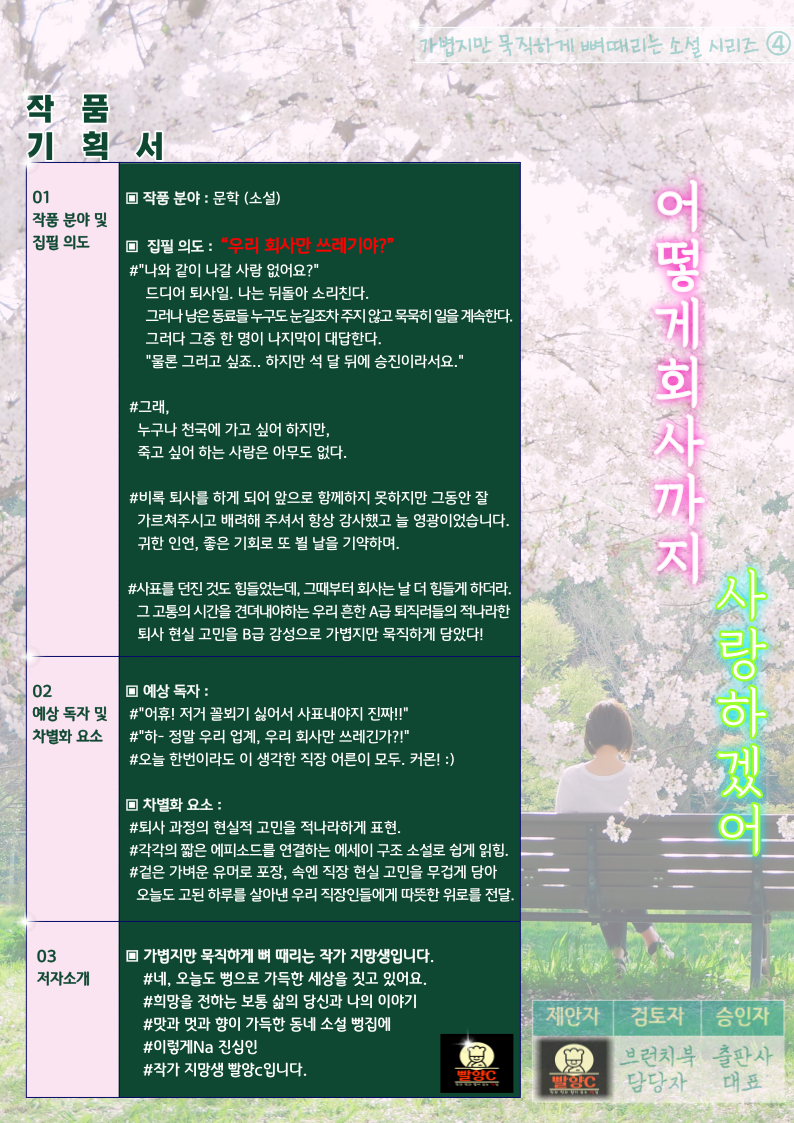 그동안 그래도 매 순간 진심으로 썼던 5편의 소설을 응모했어요. 퇴고를 하고, 나름 작품기획서와 표지도 예쁘게 꾸며봤답니다.