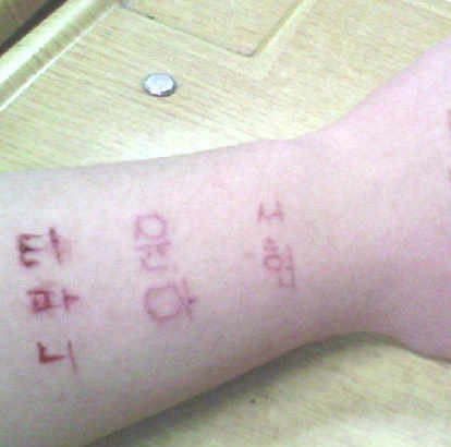 내가 6학년 때 또래 사귀는 애들끼리 서로의 이름이나 애칭을 손등이나 팔목 같은 곳에 칼로 살살살 긁어서 빨간 핏빛을 새기는 것을 말한다. 지금 생각하면 정말 미친 짓 아닌가 싶은 이상한 칼빵 문화. 그때는 그런 게 있었다. 물론 당연히 한 번도 여친이 없었던(이건 강조, 어이 와이프 보고 있지? ㅎ_ㅎ..) 나는 남의 얘기였고, 그런 주변 친구를 "말세다 말세." 하고 봤던 기억.