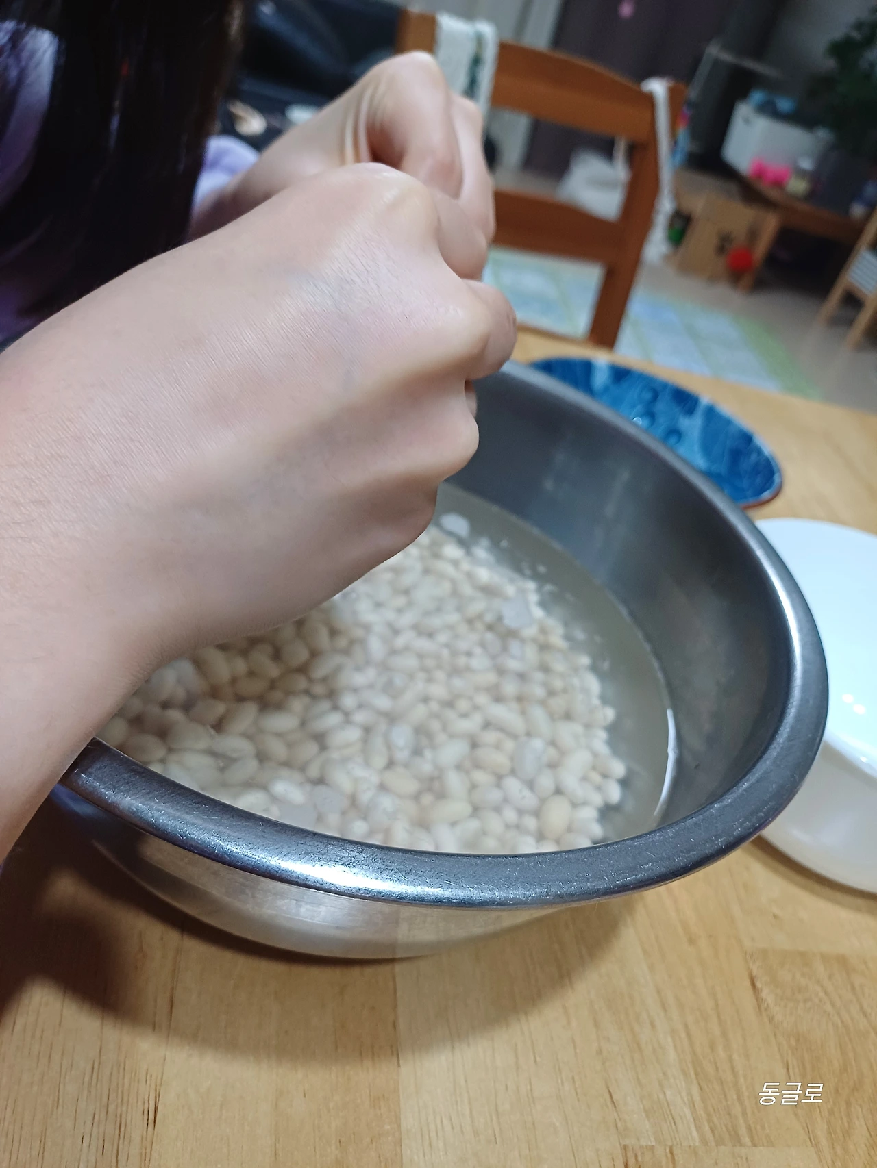 아몬드가루는 비싸니 저렴한 재료로 그냥 빵을 만들라고 했더니 집에 있는 구운 아몬드의 껍질을 까고 믹서기에 갈았다. 무서운 딸이다. 그래서 흰 강낭콩은 할 수 없이 사주었다. 강낭콩을 키울까 봐 겁이 났다. 그렇게 사준 흰 강낭콩은 물에 24시간을 불려 4시간에 걸쳐 껍질을 까고 삶아서 믹서기에 갈았다.