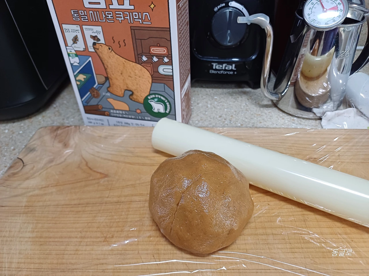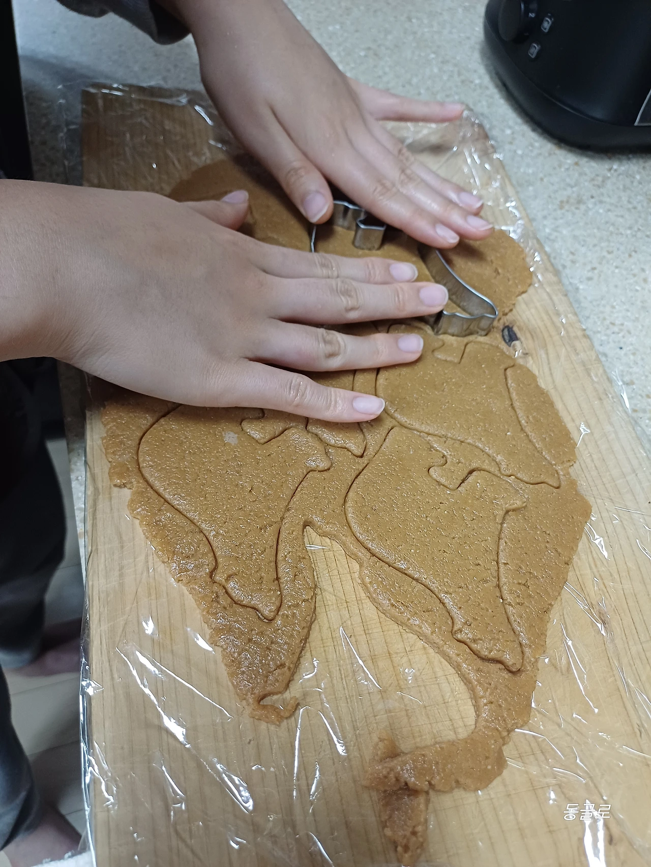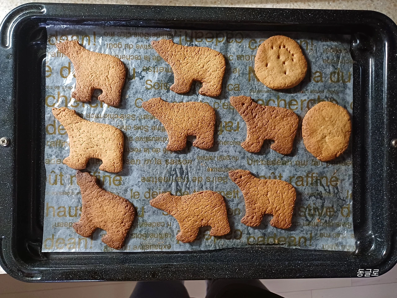 통밀 쿠키믹스로 가볍게 통밀쿠키도 만들어 주었다. 곰에 눈을 만들자고 했지만 쉽게 허락되지 않았다. 두 마리에만 겨우 눈을 찍어주었다. 굉장히 깐깐한 요리사다.