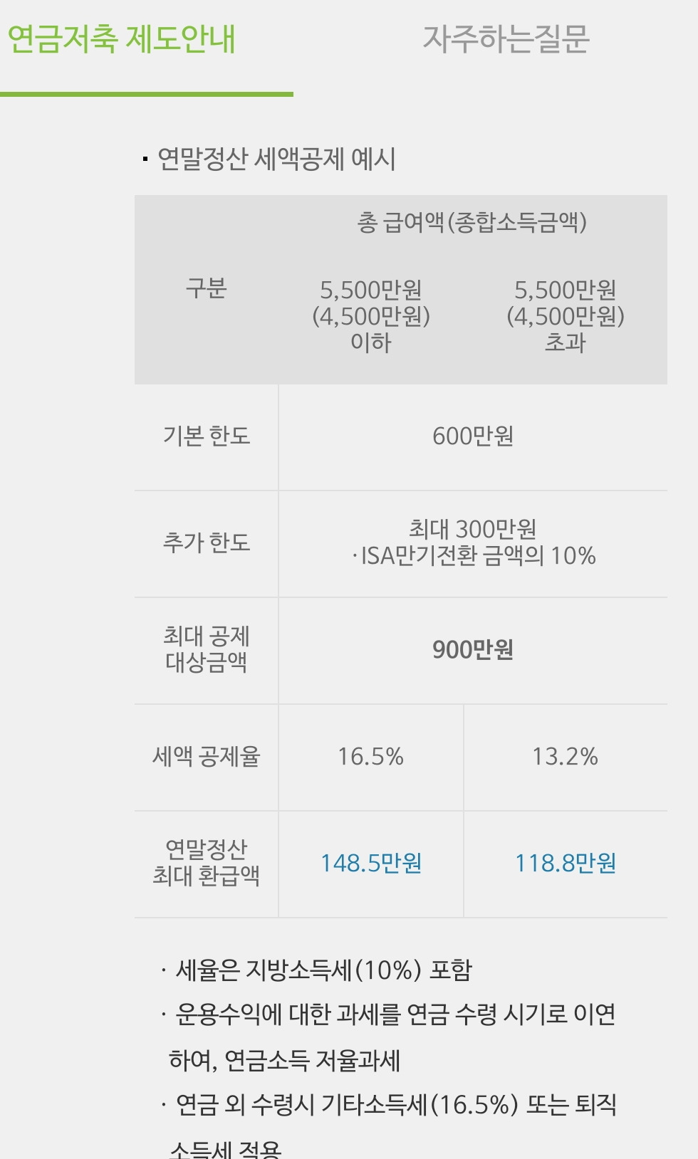 과거에는 예금 4%에 초점을 맞췄다면(불과 몇 년 전엔 1%) 지금은 세액공제에 비중을 두려고 합니다. 많게는 16.5% 적게는 13.2%까지 받을 수 있어서 좋고, 아이들 학원비, 생활비가 아닌 부부를 위한 노후대비로 일단 챙겨두려고요.