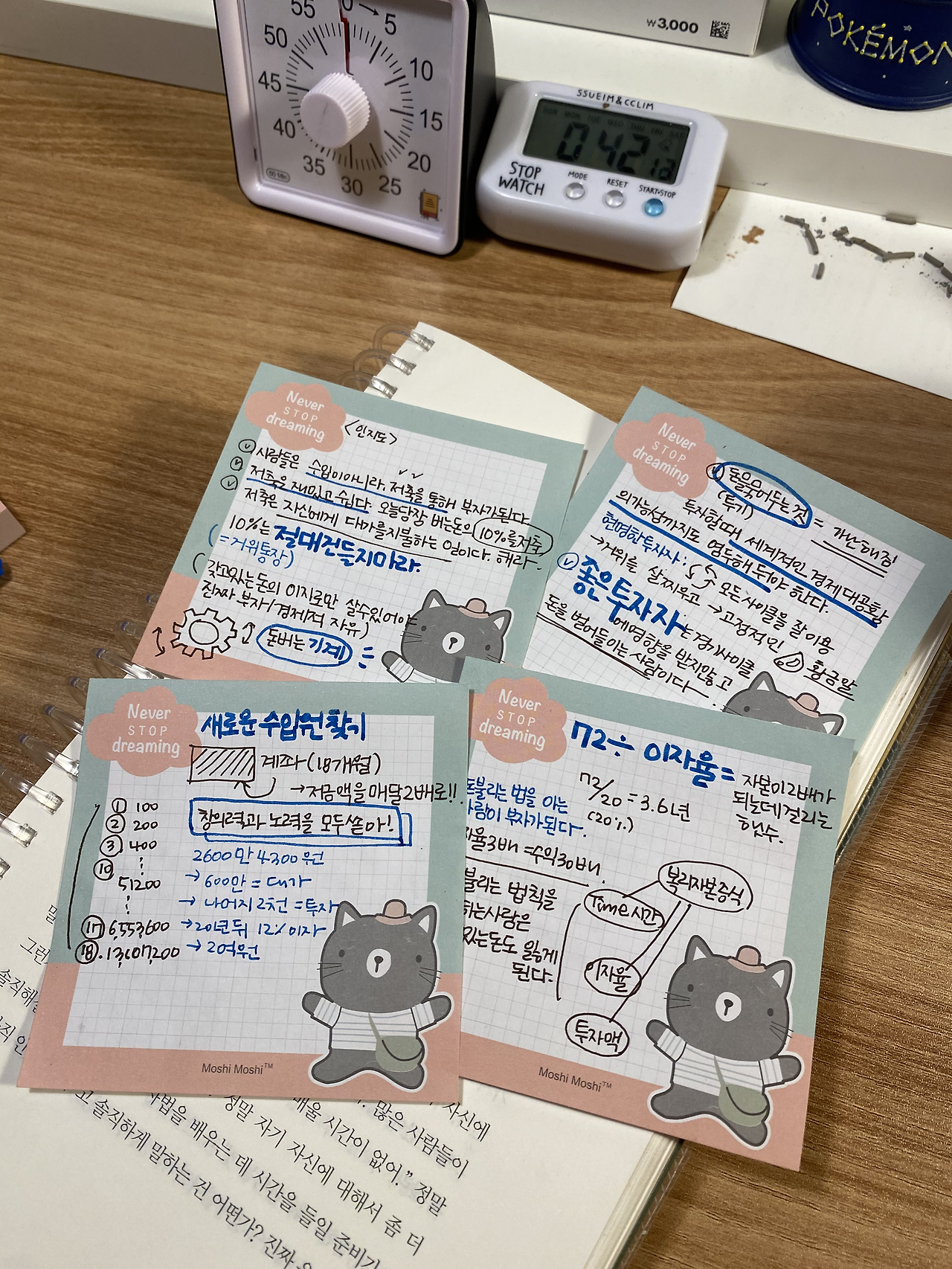 어디에 메모를 하는것이 더 좋은지 질문하는 사람들이 종종 있다. 항상 나의 대답은 "둘다 좋아요" 이다. 마치 이전 글에서 말했듯이 종이책과 전자책을 병행하여 읽는 것 처럼, 여기저기 메모의 내용에 따라, 느낌에 따라 내맘대로 아날로그 메모를 꾸준히 한다. 꾸준히 나의 생각이나 배움의 흔적들을 여기저기에 남겨놓는 것이다. 도구들과 형식에 구애받지않고 무언가를 손으로 쓰는 행위 자체가 아름답다.