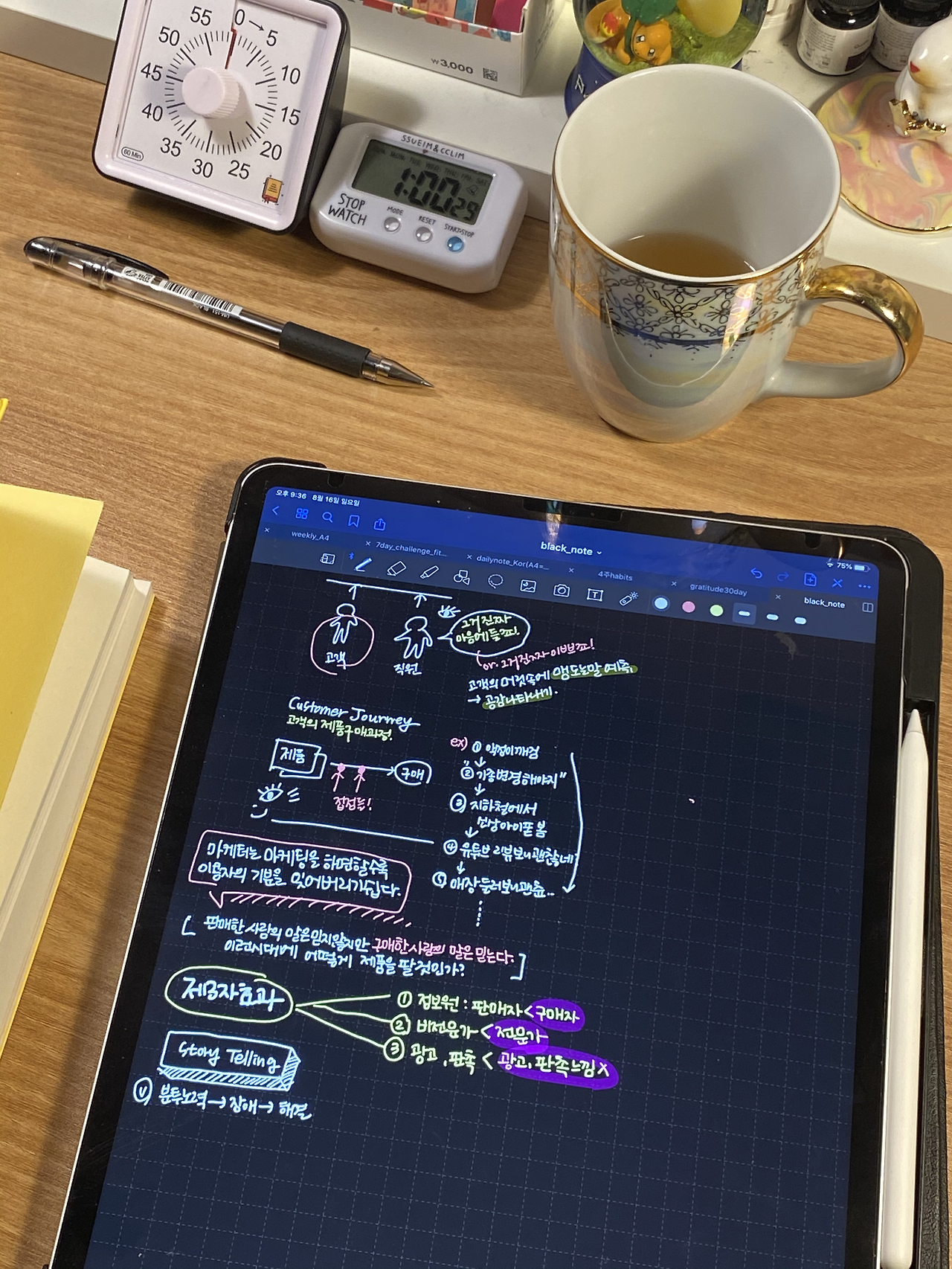 나는 다양한 수첩,메모지 등의 종이에 메모하는 것을 좋아한다. 종이 질감에 꾹꾹 눌러담아 정성스럽게 쓰는, 아날로그의 향기가 폴폴 풍기는 메모는 나에게 살아있다는 느낌을 주곤 한다. 또한 아이패드에 슥슥 메모하는것도 아주 매력적이다. 내가 원하는 컬러와 두께, 모든 질감의 붓을 자유자재로 활용할 수 있으며, 화면에 메모하는 것이기 때문에 손에 힘을 주지 않아도 자연스럽고 부드럽게 메모가 이어진다. 저장해놓고 스마트폰에서, 노트북에서 연동하여 활용할 수도 있고, 디자인툴을 활용하여 조정하면 많은 사람들과 공유할 수도 있다.