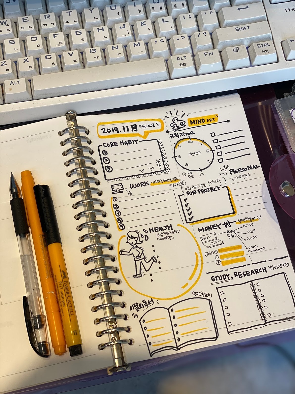"나는 나의 일을 사랑하며, 내 가족과 주변 사람들을 사랑하고, 몸과 정신이 건강하게 매일매일 성장하면서 금전적으로도 풍족한 삶을 살 것이다"라는 가치관에서 비롯한 나의 우선순위 카테고리들을 하나씩 나눠서 핵심 목표들, 핵심 습관들을 아주 명료하고 간단하게 적어본다. 독서하고 싶은 것, 공부하고 싶은 것, 업무적인 성과를 이루고 싶은 것, 나의 몸과 마음의 건강까지! 단 한 가지라도 빠지면 균형이 깨져서 한 달 전체가 무너질 수 있다. 예를 들어, 가족이나 지인들과의 관계가 무너지면 몸과 마음이 아프고, 심지어 독서도 잘 안되고 일도 잘 안된다. 따라서 스트레스를 받으니 금전적으로도 충동적인 소비를 하기도 하고, 배움을 등한시하게 되기도 한다.