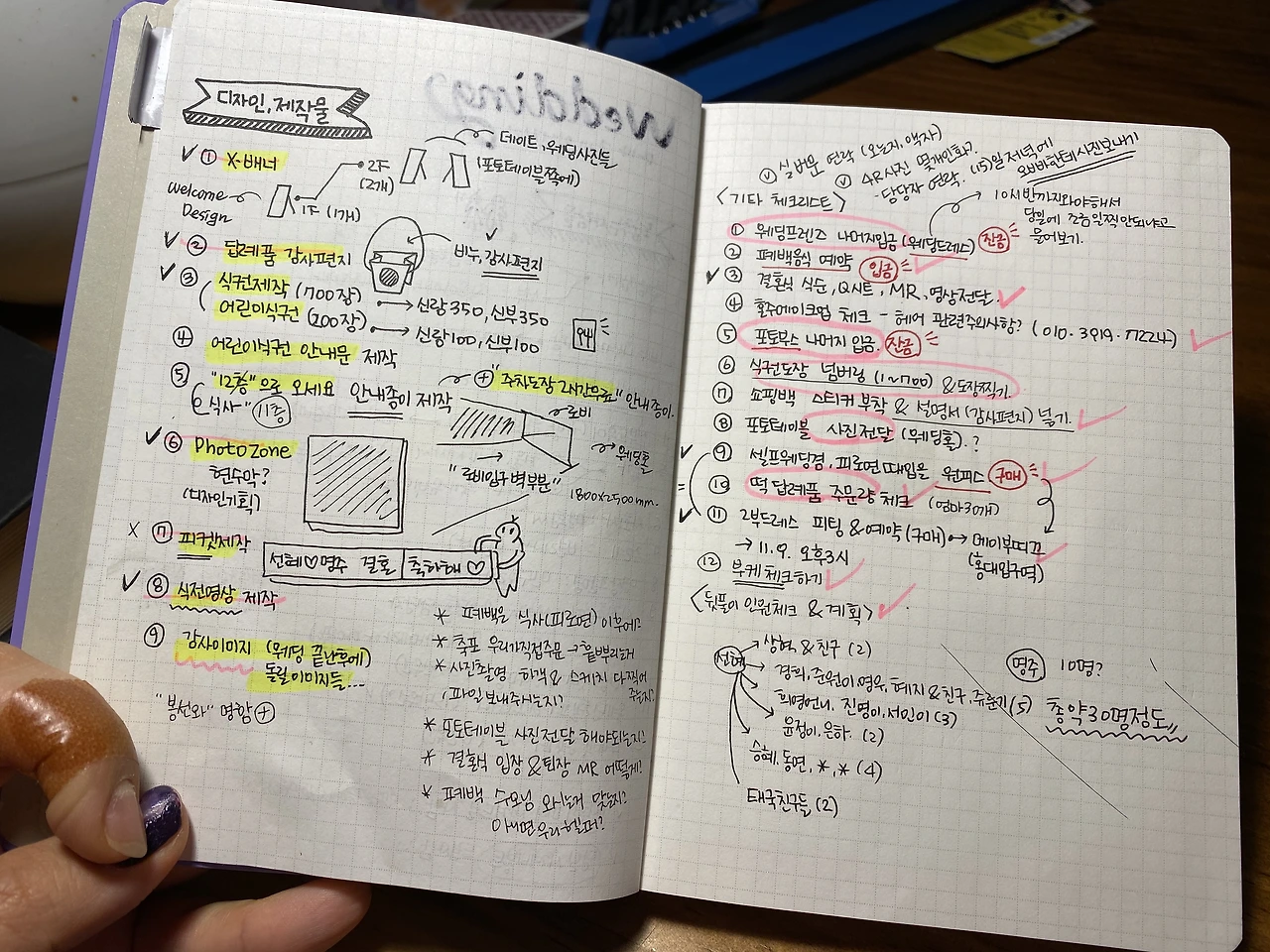 지난 노트들을 정리하다가 약 1년전에 메모했던 D-14 결혼준비 체크리스트를 발견했다. 청첩장과 초대홈페이지부터 시작해서 결혼식장에 쓰일 디자인제작물을 직접 제작하고, 답례품,식권,안내판,식전영상,배너와 포토존,답례품,축가섭외 등등 모든 과정을 하나하나 빠짐없이 축제기획하듯이 직접 기획했었다. 지금보니 그때의 열정이 느껴진다. 결혼도 결국 행사기획이랑 똑같은 것같다. 행사관련 디자인기획을 많이 했었기 때문에 속전속결로 모든 컨셉을 내 생각대로 진행할 수 있었다.