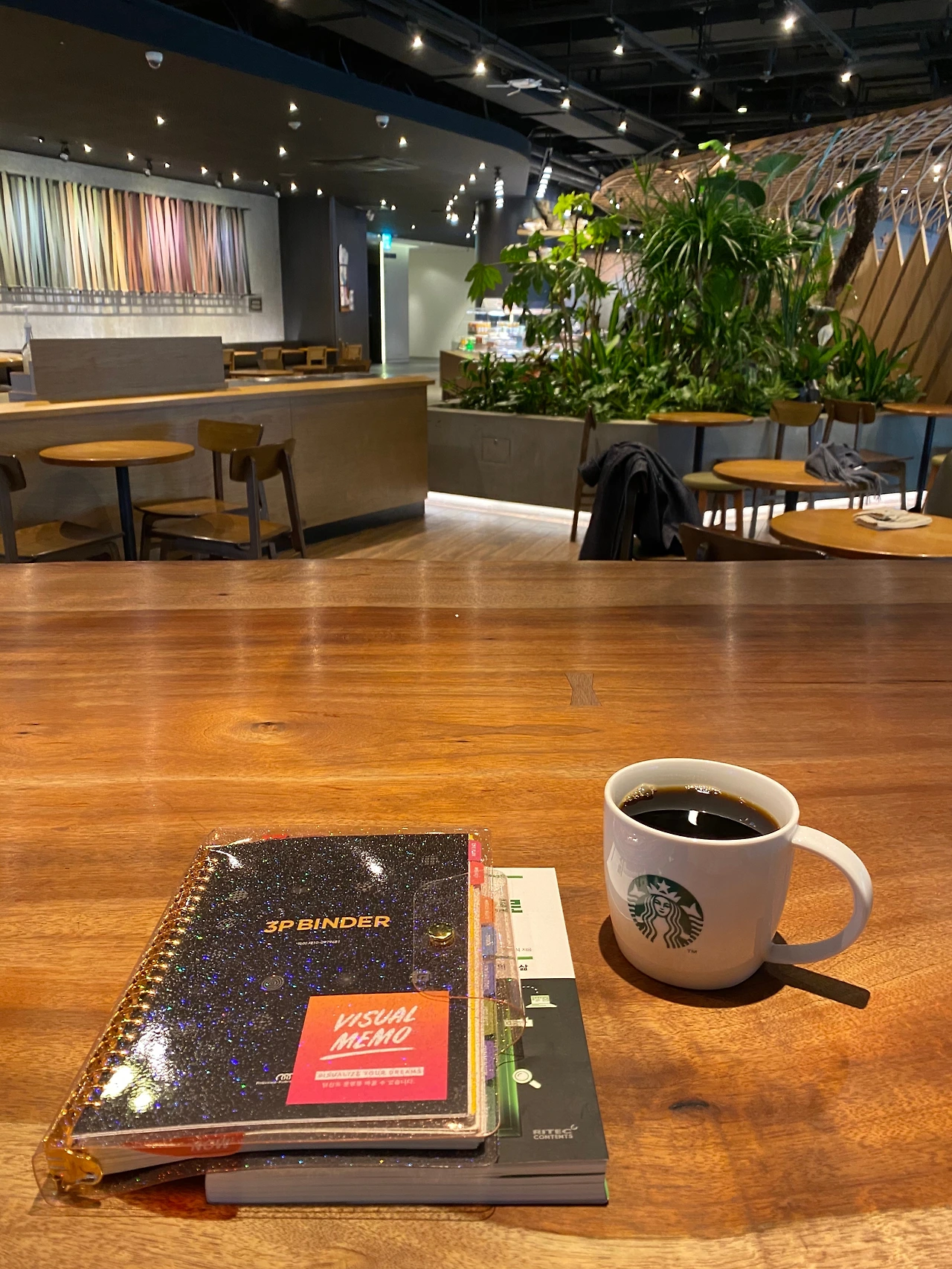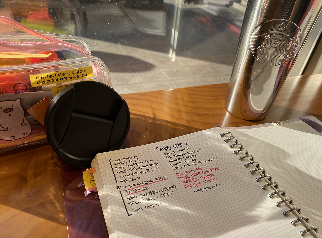 공간의 힘은 대단하다. 집에서의 공간도 중요하지만 카페에서의 널찍한 테이블과 커피향, 그리고 약간의 백색소음은 내가 살아있다는 느낌을 주기도 하고 에너지를 증진시켜준다. 이 모든 행위를 집이나 일터에서 할 수도 있겠지만 내가정해놓은 같은 시간에 같은 행위를 하는 하나의 루틴으로 자리잡아 놓는것이다. 습관은 어떤 좋아하는 것과 자연스럽게 연결지었을 때 가장 잘 수행할 수 있다. 이 시간에는 꼭 스타벅스를 와서 다이어리를 정리하거나 책을 읽는다! 라는 규칙이 나도모르게 정해지다보니 하루의 시작을 계획과 독서로 시작할 수 있게 되었다. 아주 잠시라도 무언가를 곰곰히 생각할 수 있는 시간이 주어진 것이다.