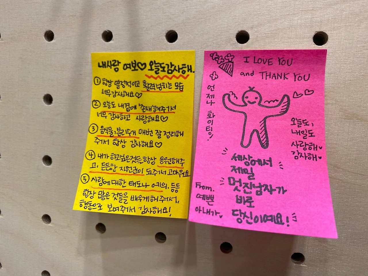 포스트잇에 메모를 남기는 시간 단 10분, 10분만 투자하면 끄적거리면서 감사한 것들을 쭉 적어볼 수 있다. 냉장고에 붙여도 좋고 남편이 볼 수 있는 곳에 붙이거나 사진을 찍어서 카톡으로 보내줄 수도 있다. 너무 오글거릴 수 있지만 구체적으로 하나하나 감사한 것들을 직접 보여주게 되면 나 자신도 남편에게 하나라도 더 감사하게 되고 남편도 자존감이 높아질 것이다. 편지지를 사서 편지를 써줘야겠다고 생각하는 순간 쓰기도 전에 지친다. 그래서 나는 포스트잇 메모로 간단히 편지를 쓰거나 감사한 것들을 쓰는 것을 좋아한다. 학생시절, 독서실이나 학교 수업시간에 쪽찌에 끄적끄적 하고싶은 말을 주고받는 것처럼 소꿉장난 하는 느낌도 든다.