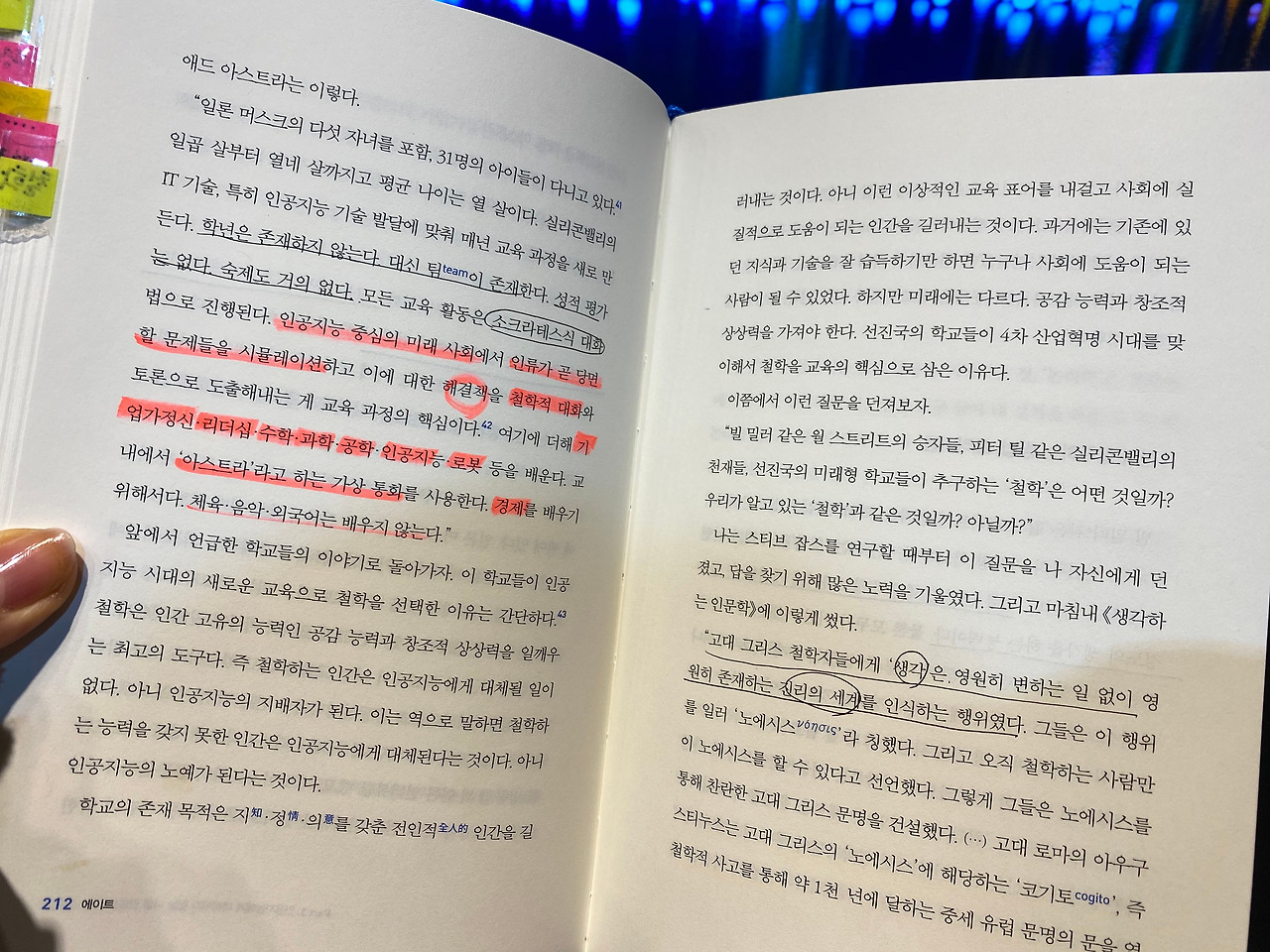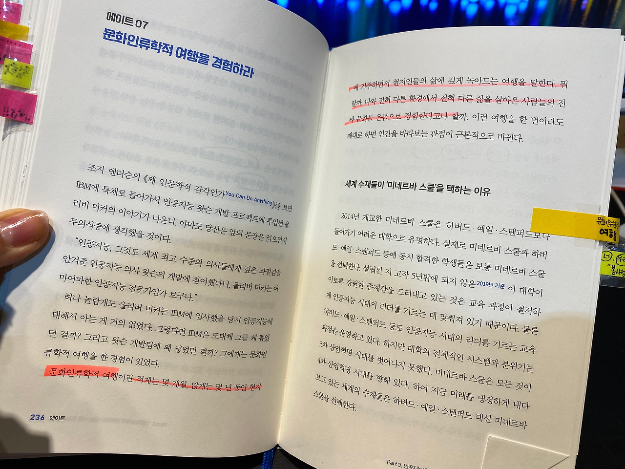 이 책에서 이지성 작가님은 인공지능시대가 미래의 일이 아니라 얼마나 현재진행형인지, 그리고 인공지능에게 대체되지 않는 나를 만들기 위해 어떻게 준비해야하는지에 대해 끊임없이 외친다. 해외 몇몇 사례만 봐도 전세계에서는 인공지능시대를 이미 아주 오래전부터 준비해왔다. 언론에서는 '인공지능 인공지능' 떠드는데, 다들 인공지능이 어차피 내가살아있는 동안은 별로 나와상관없는 일이라고 생각할지 모르겠지만, 조금만 검색해보아도 현재 전세계에서는 실제로 인공지능이 엘리트들만이 할 수 있는 거의 모든 전문분야에서 인간을 대체하고있다. 법률서비스,의료서비스,금융서비스,교육서비스 등등 초엘리트들이 모인다는 핵심분야를 훨씬 경제적이고 효과적으로 해결할 수 있는 인공지능이 점령할 것 같다. 실제 미래를 설계하는데에 있어서 지금까지와는 완전히 다른방식으로 접근해야하고, 생각보다 빠른속도로 세상이 변화하고 있다는 것을 감안하면 '부'의 판도와 '성공'의 척도가 확실히 달라질 것 같다. 벌써부터 뉴욕의 타임스퀘어 상가공실률이 최근2년간 2배인 20%로 늘었고, 서울 핫플레이스라고 불리우는 대표상권들의 1층 공실률이 정말 미친것처럼 텅텅 비어있다는 것을 매일 눈으로 확인하고 체감한다. 멀게만 느껴졌던 전 세계의 모든 상품을 집에서 받아볼 수 있는 게 당연시되면서 이미 예견된 결과이기도하다. 불과 5년전까지만 해도 예상치 못한 일들이다. 오랫동안 세계최고의 뛰어난 트레이더들은 대체불가능한 인재였지만, 그 인재들을 고용하는 것보다 인공지능과 빅데이터기술로 무장된 트레이딩 자동화시스템이 엄청난 수익을 가져다주는것이 입증되면서 판도가 바뀌었다. 앞으로의 5년은 지난5년보다 기하급수적으로 상상이상으로 변화가 더 빠를 것이다. 에이트에서는 이 인공지능시대에 전세계의 기업에서, 교육계에서 어떤식으로 움직이고 있고 준비하고 있는지 상세하게 설명해주면서 경각심을 불러일으켜 주고 있다. 이어서 나오는 인공지능시대에 대체되지않는 나를 만드는법 여덟가지가 나오는데 매우 흥미로웠다. 아이가 있는 부모입장에서는 아이들 교육을 어떻게 시켜야하는지, 그리고 지금 현재 나자신이 어떤방향으로 배움을 이어나가고 미래를 준비할 것인지 많은 인사이트를 주게된다.