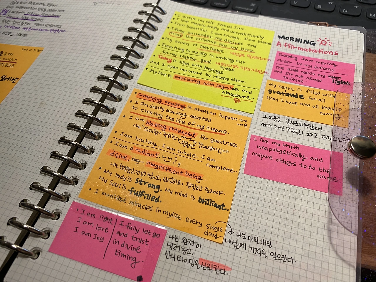 10월부터 내 삶을 송두리째 바꾸겠다고 결심한 이후로 다시 확언을 아침마다 들여다 보기 시작했다. 유튜브와 책, 그리고 SNS정보들을 통해 다양한 확언들을 정리하여 나만의 방식으로 확언들을 매일 보려고 노력했다. 몇년전, ‘미라클모닝’ 책에서 확언에대해서 접하게 되었는데, 이제서야 제대로 실천하고 있다. 다짐과 확신의 말을 매일 궁시렁대고 눈으로보면서 완전히 뇌리에 박히도록 새겨넣어보았다.