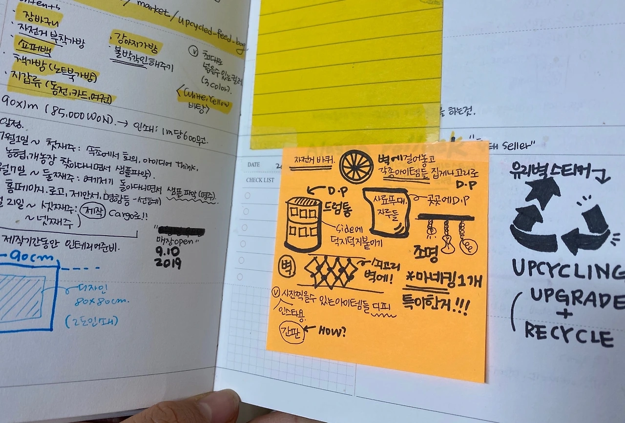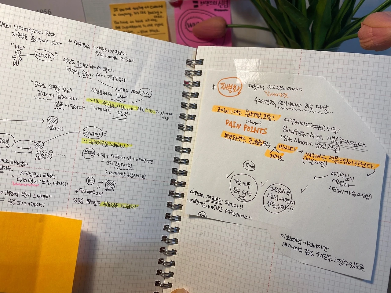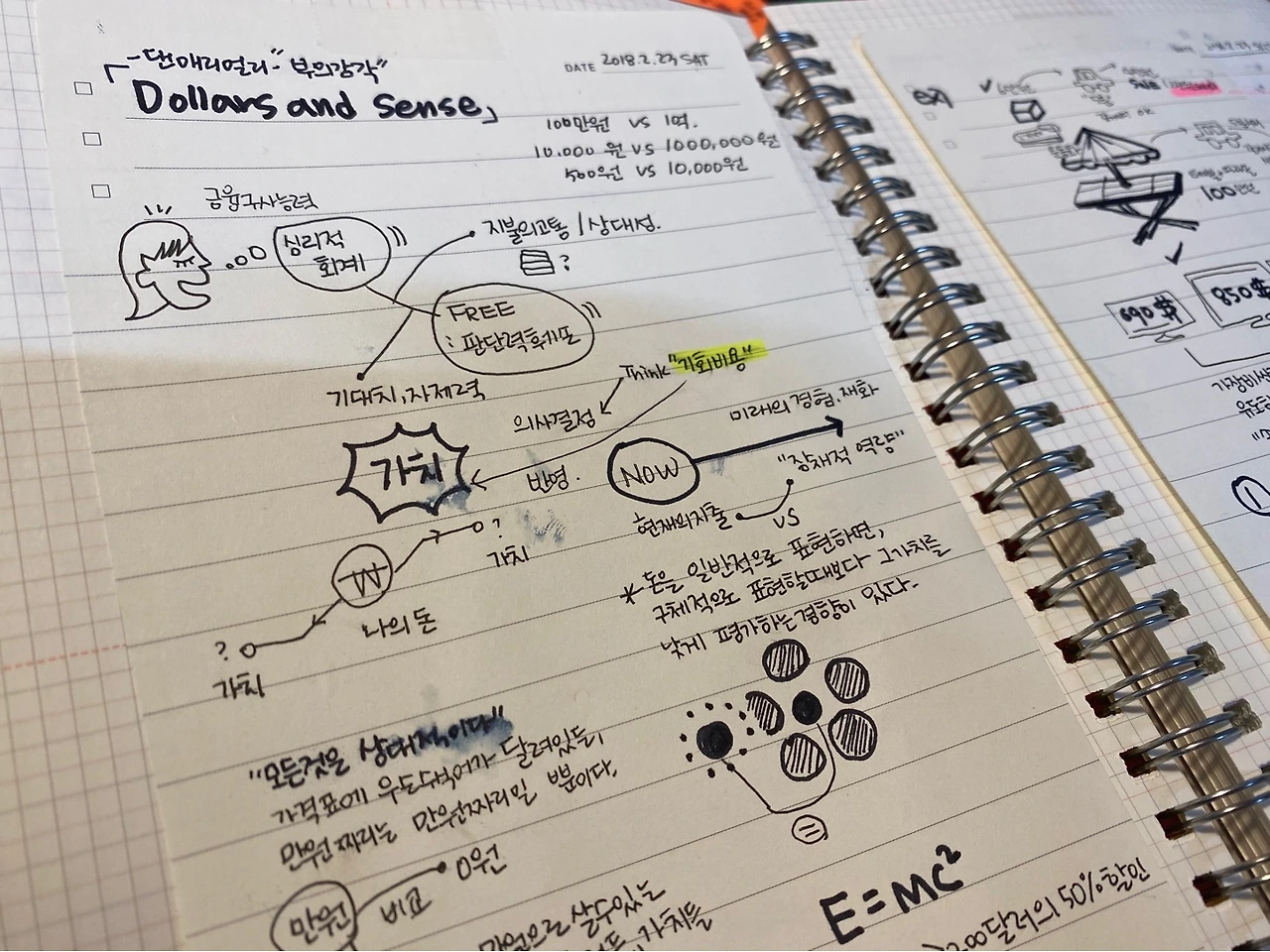 낙서하듯이 끄적끄적 도식화하면서 내용들을 정리하다 보면 나도모르게 새로운 아이디어가 파생되곤 한다. 왜 꼭 노트필기처럼 일렬로 글씨를 나열해야 하는가? 이미지, 단어와 단어에 꼬리를 물어 새로운 체계를 형성하기도 한다. 분명 유튜브나 책을 읽다가 메모해놓은 것인데 그 옆에 내가지금 하고 있는 일이나 새롭게 하고 싶은 것들, 내가요즘 집중하고 있는 것들에 대한 아이디어가 파생되어 실행 방안들이 나오곤 한다. 책을 읽거나 강의를 듣다가 잠깐 멈추고 이런저런 메모로 생각에 잠기다가 바로 실행한다. 그렇게 탄생한 나만의 차별화는 실적이나 매출로 보답받는다. 대충 끄적여본 메모가 곧 실적이나 매출로 직결된다는 게 참 신기하고 재미있는 일이다. 아주 작은 끄적임은 세상을 바꿀 수도 있는 놀라운 결과를 일으킬 수도 있는 잠재력을 지니고 있다.