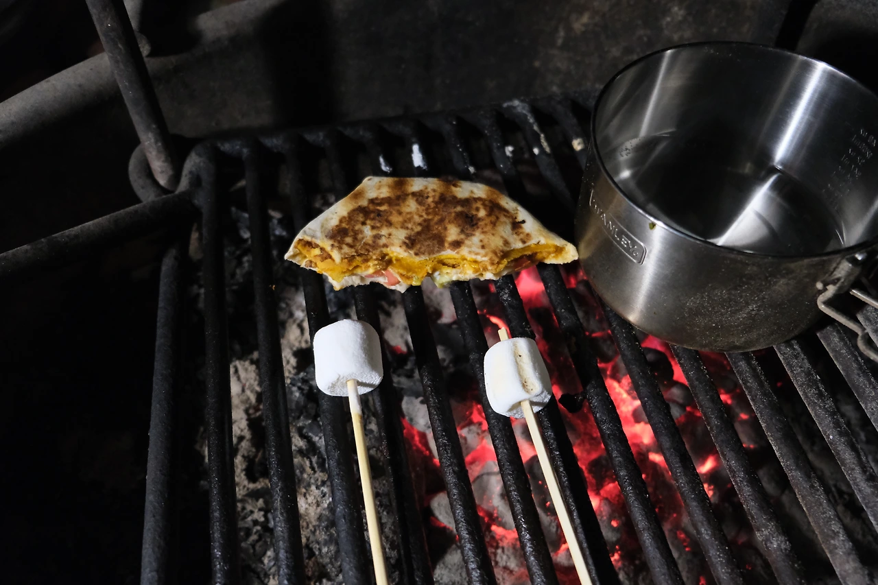 첫째가 그렇게 많은 고기를 맛있게 먹은 건 태어나서 처음이었다. 우리는 그 불에 닭꼬치, 퀘사디아, 라면을 올려가며 조용히 이야기를 나눴다. 구운 마시멜로는 겉이 바삭하지만 속은 구름처럼 부드럽다는 것도 이날 처음 알게 됐다.