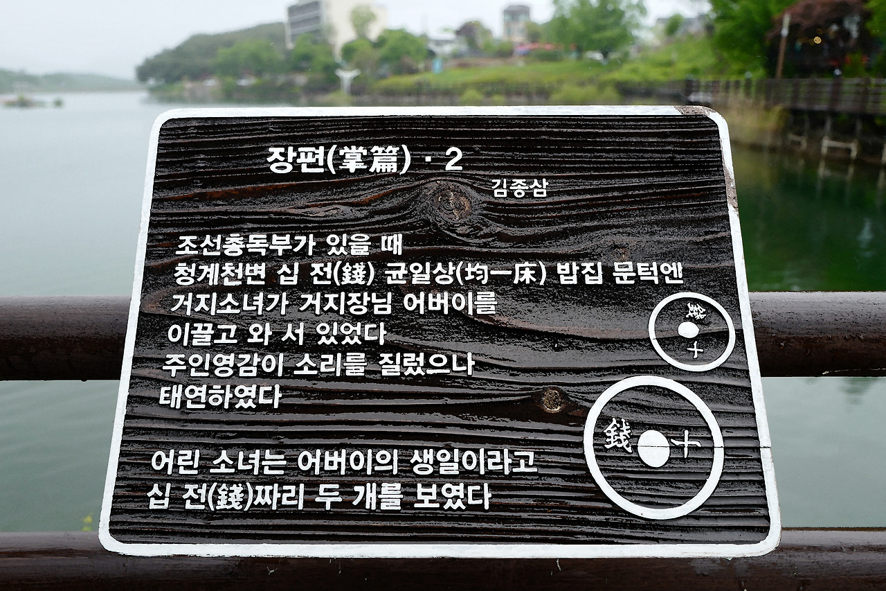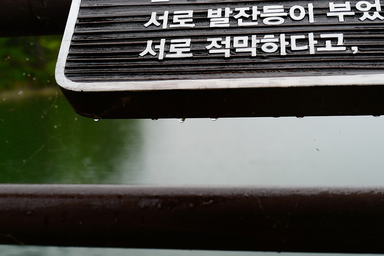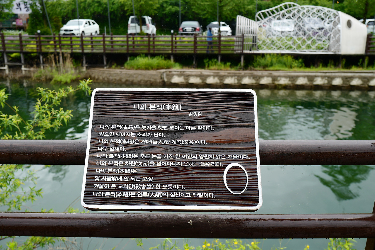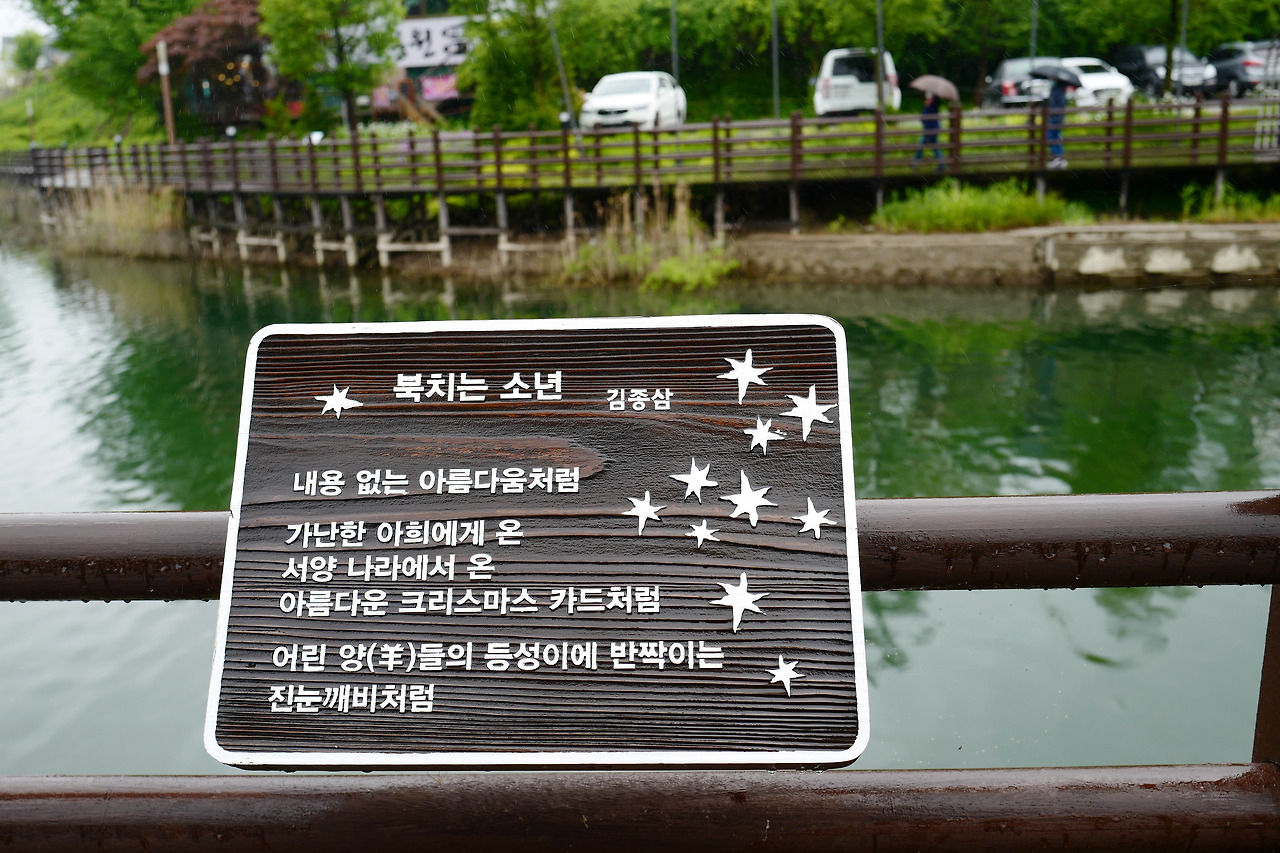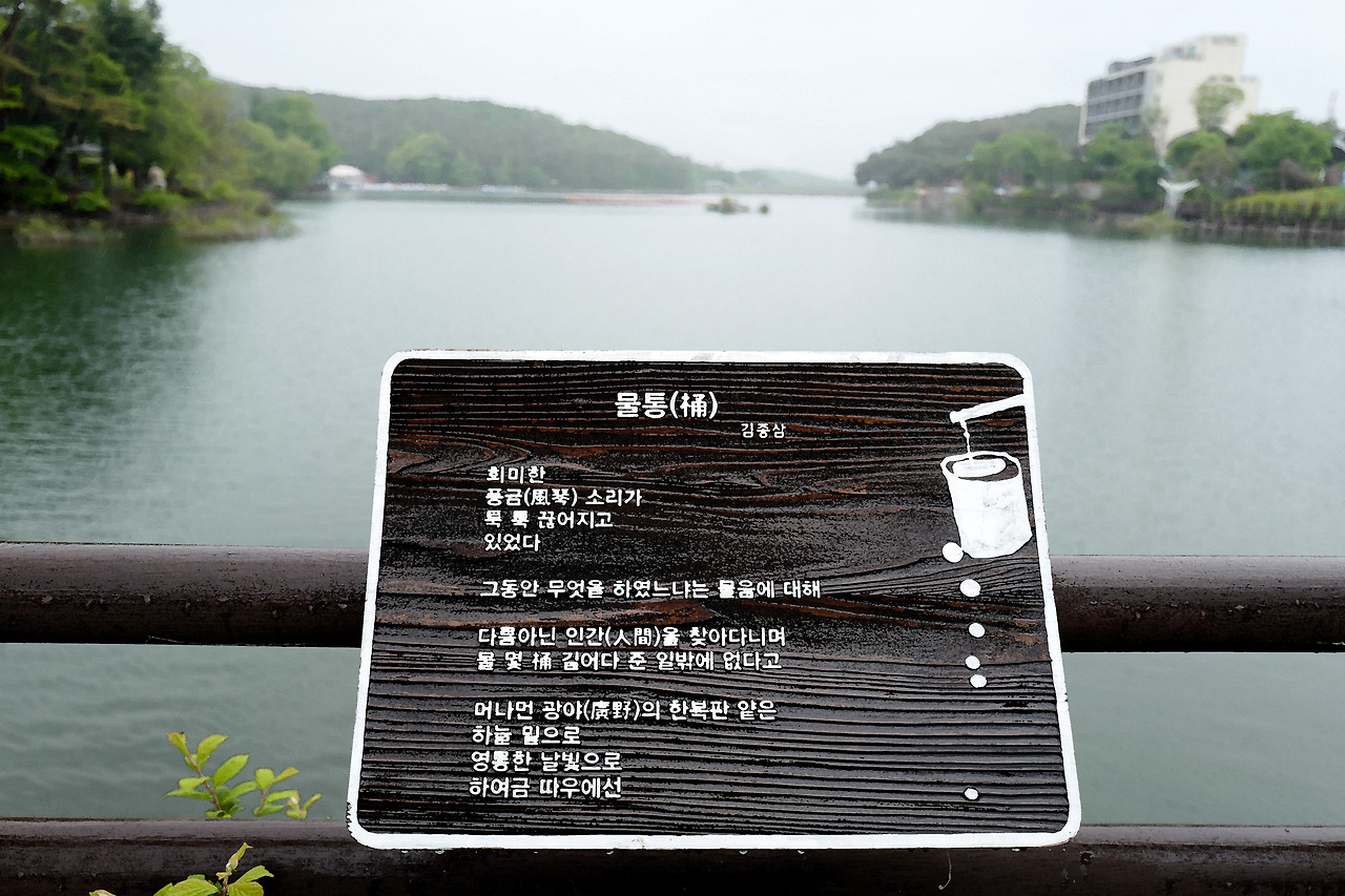 광장의 호수가에 그의 대표작을 적은 나무 시비가 걸려 있다. 시 하나씩 하나씩 꼼꼼하게 읽으며 나간다 어차피 비도 오니 딱히 할일도 없다.