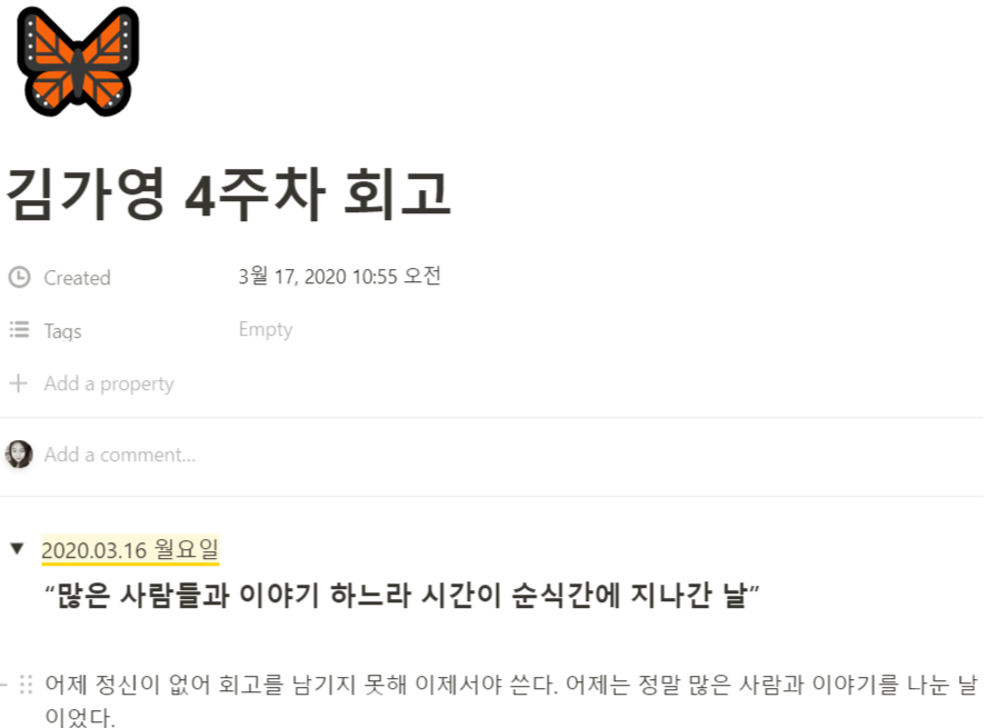 회고 클럽 1기는 우다다 구성원 중 마음 돌봄 서비스를 제공하는 스타트업에서 일하는 개발자 친구가 주도적으로 조직한 모임으로, 말 그대로 '회고'를 좀 더 의미 있는 방식으로 시도하기 위한 모임이다. 노션 페이지에 마치 블로그를 쓰듯 매일 각자 일일 회고(짧은 일기)를, 한 주가 끝날 때에는 주간 회고를 남기는 간단한 활동이었다. 매주 토요일 저녁에는 행아웃으로 만나 주간 회고를 나누는 시간을 가졌다.