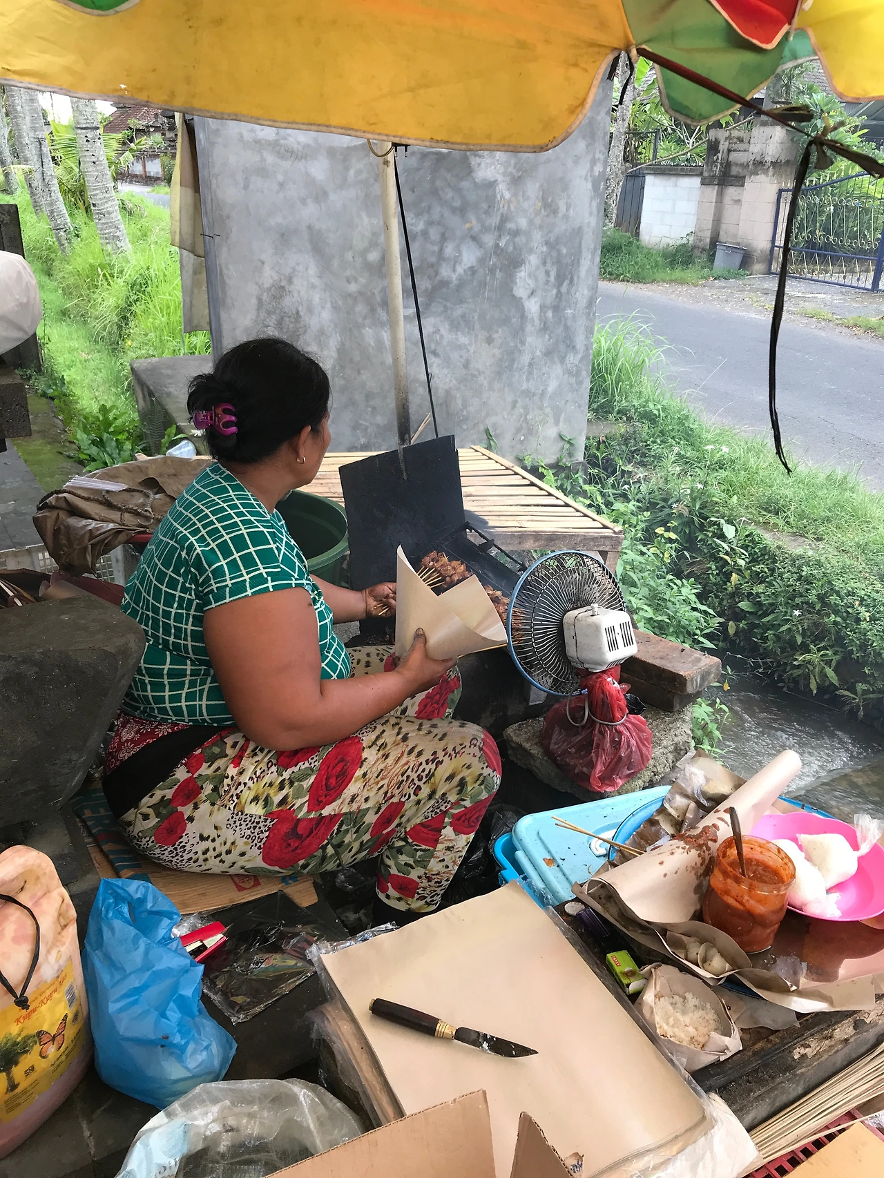 저녁은 숙소 앞에서 바비사테(돼지고기 꼬치)를 구워 팔던 아주머니네 사테를 맛보기로 했다. 한적한 숙소 앞 골목은 관광객들이 다니는 번화한 거리가 아니다. 현지인들도 그 길을 걸어 다니진 않는다. 아주머니는 남편과 번갈아 이곳에 나와 오후 몇 시간만 나와 사테를 구워 파는 것 같았다. 누가 와서 먹을까 싶은 자리였는데도 늘상 한 둘씩 사람이 있었다. 주로 동네 사람들이었다. 익숙하게 돈을 내는 로컬 사이에서 가격을 묻는 외국인에게 바가지를 씌우지 않을까 싶어 봉투에 사테를 담아 사가는 앞사람에게 조용히 얼마냐고 물어봤다. 하지만 부처님 인상의 사테 아주머니는 바가지 같은 것에 관심이 없어 보였다. 빠른 손놀림으로 바비사테를 굽고, 밥을 싸갈 건지 묻고 양념과 함께 검은 봉투에 넣어주셨다.