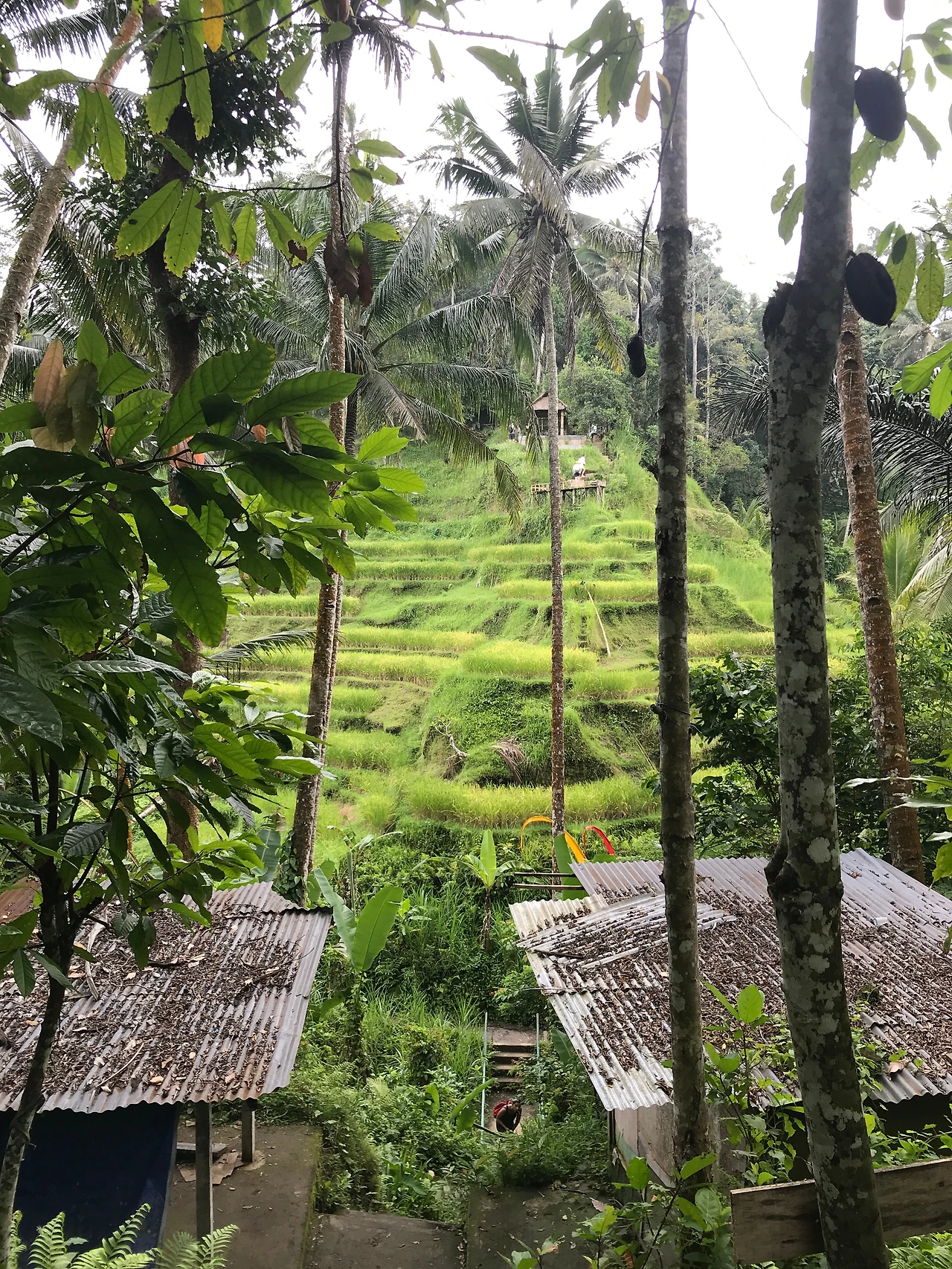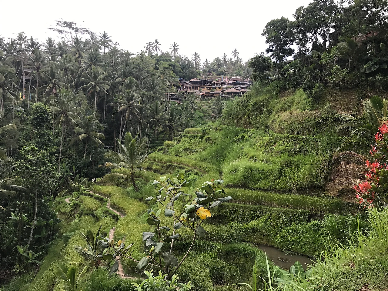 스쿠터를 빌린 기념으로 그간 엄두를 내지 못했던 곳을 차례로 가보자고 남편과 얘기했다. 오늘은 뜨갈랄랑이다. 이름이 너무나 어려운 이곳은 우붓의 계단식 논이 있는 곳이다. 그때나 지금이나 나는 이곳의 이름을 정확히 외우지 못하겠다. 뜨갈랄랑 뜨갈랄랑 뜨갈랄랑 뜨갈랄랑. 몇 번씩 말해봐도 입에 착 붙지 않는다. 하지만 어려운 이름과 달리 이곳의 풍경은 역대급이다. 계단식 논이 없는 나라에서 자란 것도 아니고, 보성 녹차밭이나 남해 다랭이마을도 모두 다녀왔던 나지만 발리의 계단식 논은 뭔가 달랐다. 아마 우붓의 지형 때문일 것이다. 화산섬으로 이루어진 발리 중에서도 우붓에는 산과 깊은 협곡이 많다. 그러니까 계단의 높이가 다르다. 열대우림 같은 이국적인 풀과 나무로 둘러싸인 산비탈을 땅굴을 파는 마음으로 열심히 열심히 내려가서 만나는 계단식 논은 정말이지 그림 같았다. 군데군데 서 있는 키 큰 야자수가 이 그림을 더욱 환상적으로 만들어주고 있었다.