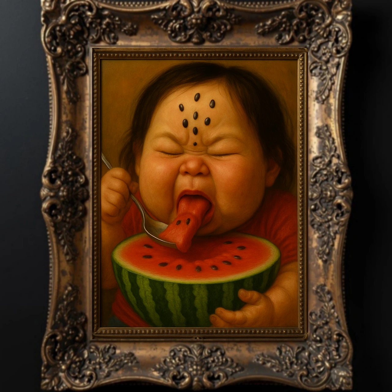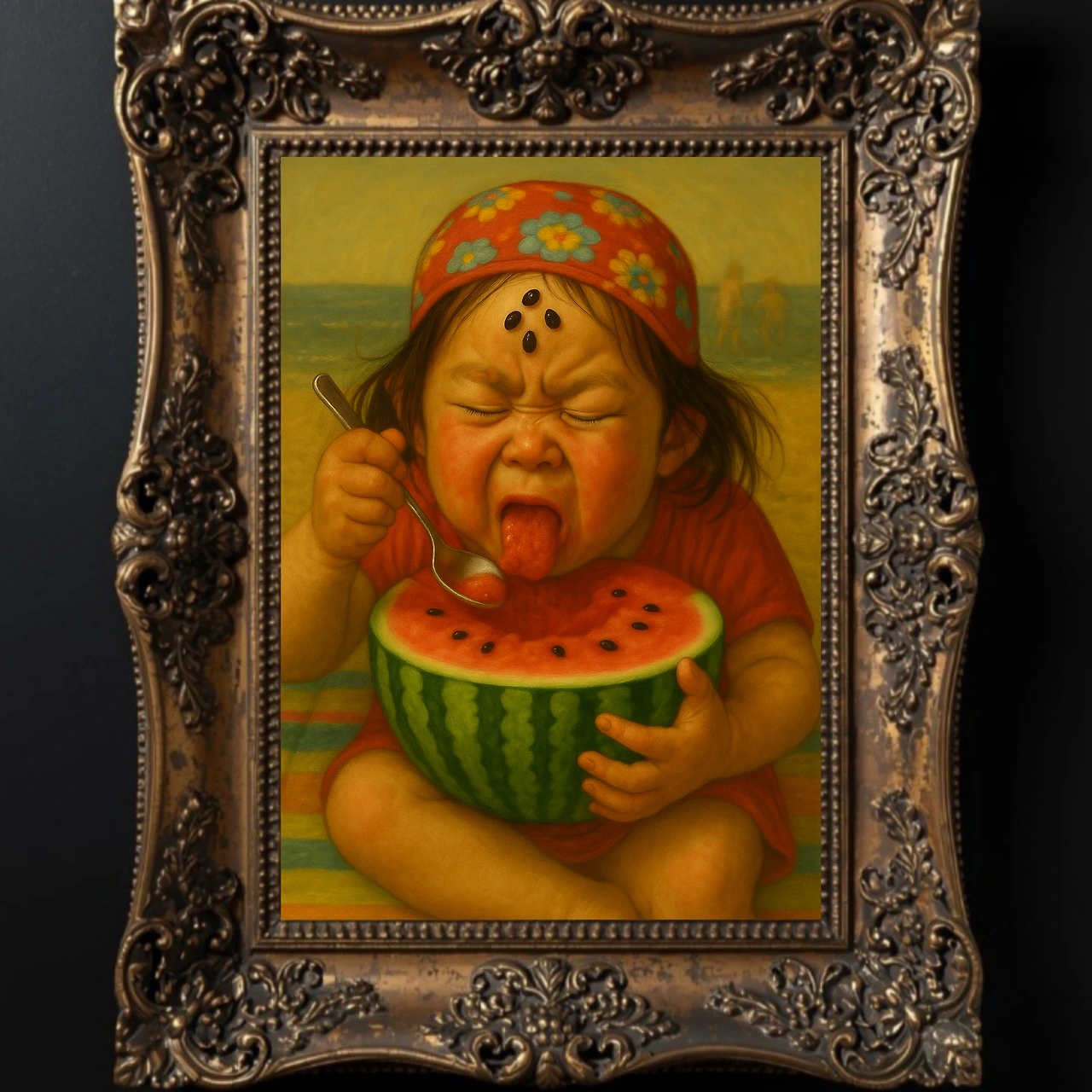 민속 부적처럼 수박씨 4개를 이마에 붙이고선.