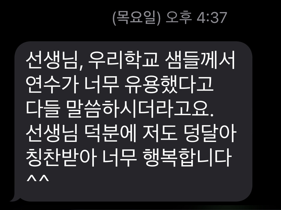 돌아오는 길에 연구부장님께서는 연수를 통해 선생님들께서 도움을 많이 받았다는 이야기를 들으셨다며 제게 감사 문자도 보내 주셨어요.