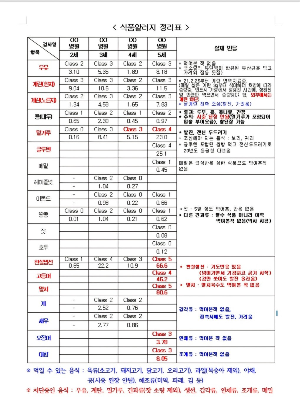 위 사진은 2살때 첫 검사를 시작으로 5살때 까지의 알레르기 반응 검사 결과를 정리한 것으로 아이가 처음으로 다니게 될 어린이집에 보내기 위해 아내가 따로 정리한 것이다. 하지만 알레르기 검사 수치는 철저하게 참고사항일 뿐이었다. 나이가 어릴수록 검사수치와 실제 반응 정도는 다르다고 한다. 실제로도 반응 수치가 0단계로 낮았던 밀가루의 경우 글루틴이 조금 포함된 쌀빵을 먹고도 전신에 두드러기 증상을 보였고. 1단계인 흰살생선을 소량을 먹고 아나필락시스 반응을 경험하기도 했다. 반면에 2단계로 수치가 높은 편에 속했던 콩은 별 반응이 없이 쉽게 통과했다. 도대체 뭘 먹여야 한단 말인가?
