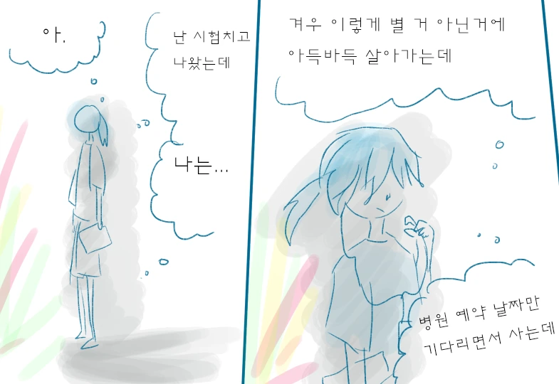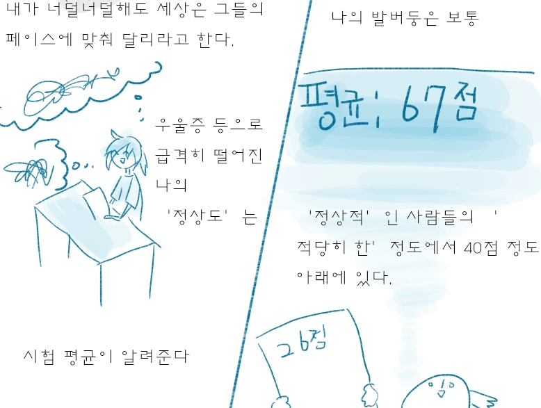 나는 최근에 온 우울과 조증으로 인해, 정신 차리면 알 수 없는 곳에 있곤 했다. 이런 정신상태인 사람이 공부를 한다고 해도 제대로 했을 리가 없다. 어떻게든 도망가는 내 정신을 붙잡고 헛구역질을 하면서 친 시험은 항상 건강한 사람들이 적당히 공부한 성적보다 훨씬 낮다. 시험 점수가 그걸 알려준다.
