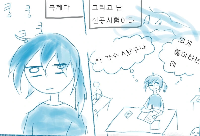 학교 축제 기간이었고 시험 시간이 저녁이었기에, 한창 무대가 뜨거울 때였다. 이 전공 시험은 나에겐 너무 부담이 컸다. 저번 1차를 너무 못 쳤는데 이번에도 공부가 잘 안 되었기 때문에 불안했다. 하필 1번부터 너무 정신없이 천천히 풀고 있는데 익숙한 노래가 밖에서 들려온다. ‘아 A가수가 왔구나. 나 이 가수 진짜 좋아하고 이 노래도 너무 오랜만인데 설마 시험 치면서 다시 들을 줄이야.’ 시험은 어찌어찌 지나갔다. 공부했던 노력을 보상받을 생각은 그만두었다. 적어도 시험을 칠 때 심한 불안감이나 조증, 망상으로 토를 하지 않았고 일단 최선을 다 했으니…. 그것만으로 나 자신에게 50점은 주었다.