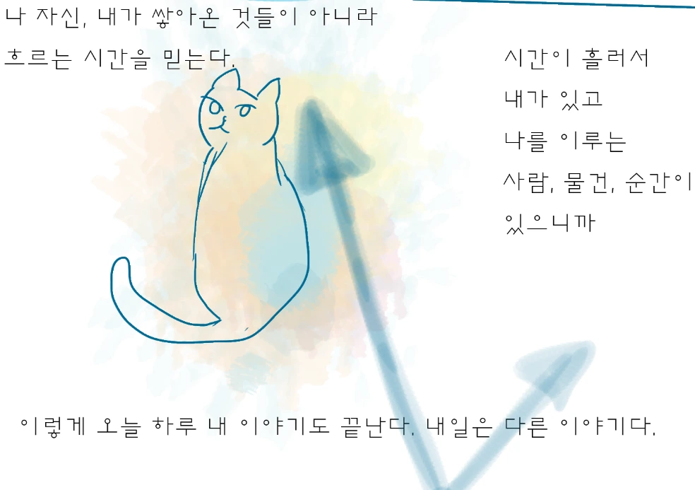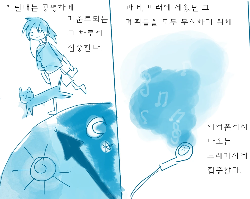 내일, 모레의 계획도 하려고 했던 과거의 계획도 생각하지 않으려고 노력한다. 눈 앞에 하고 있는 것에만 집중하려고 한다. 길을 걸으면서 하루 계획을 미친 듯이 짜고 재보는 게 아니라 이어폰으로 나오는 노래의 가사에 집중한다. 아무 생각 없는 것 같아도 이렇게 지나온 하루하루가 쌓여서 내 삶이 되었다. 실력도 노력도 운도 나 자신도 믿지 않는다.