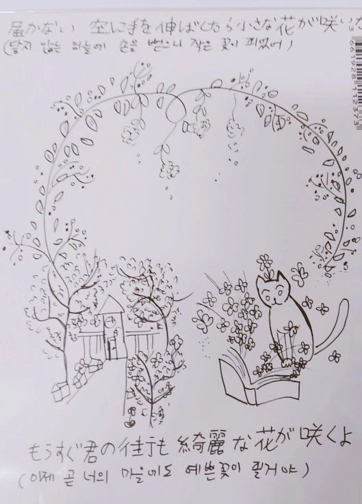 닿지 않는 하늘에 손을 뻗으니 작은 꽃이 피었어. 이제 곧 너의 마을에도 예쁜 꽃이 필거야.