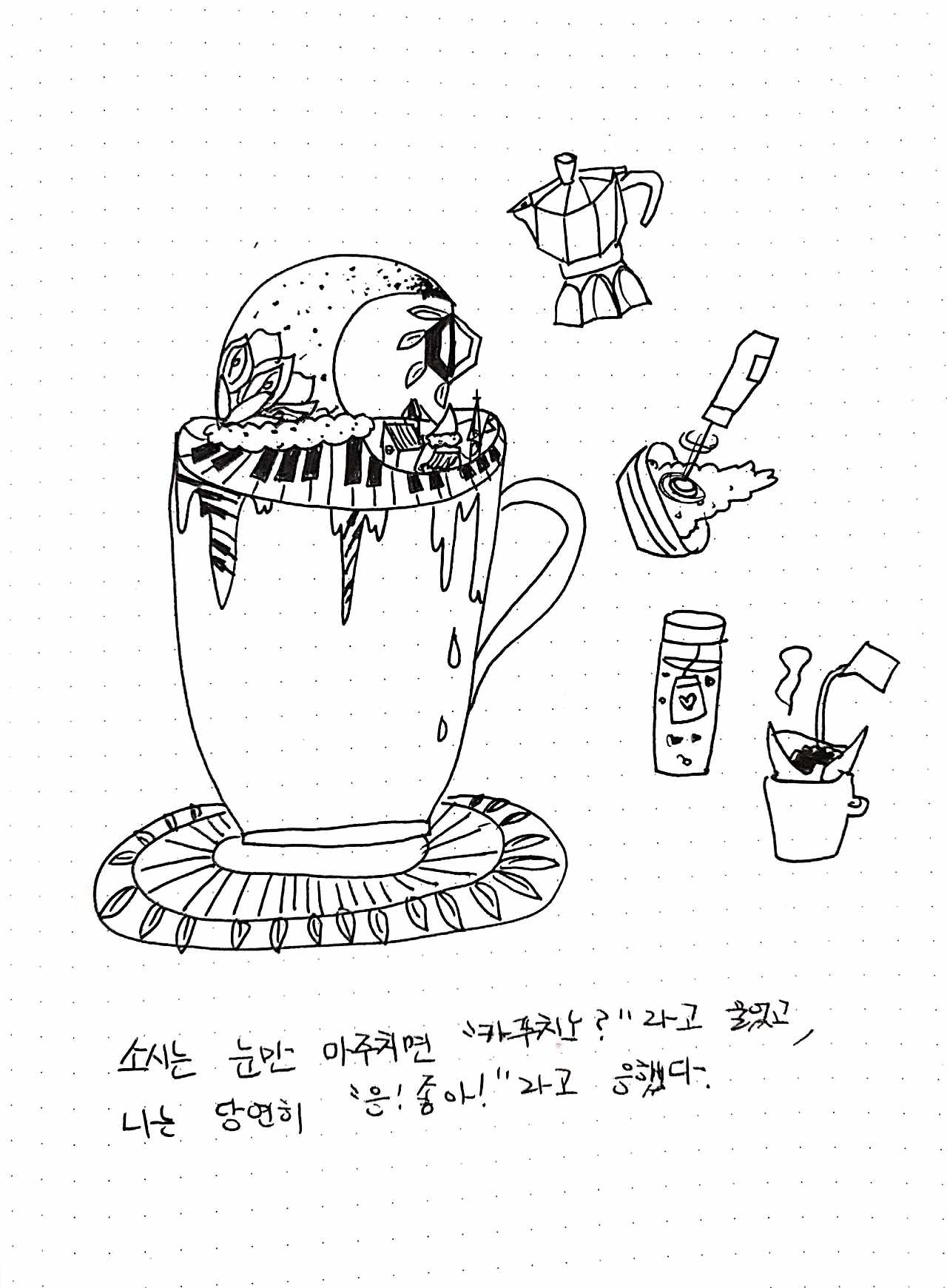집에 가끔 가면 여러 믹스커피로 허접한 커피를 만든다. 그냥 믹스커피를 달게 마셔왔던 엄마는 우유, 카누, 맥심, 가끔 휘핑크림 등으로 카페랑 비슷하게 만드는 집 커피가 신기하나 보다. 그러니까, 내가 만드는 커피는 '내린다'던가 '좋은 원두'라는 단어와는 아주 먼, 누구나 만들 수 있는 커피이다. 유튜브나 트위터, 여러 서적에서 '집에서도 간단히 만들 수 있는' 커피 레시피에 아주 예전에 카페 알바를 했던 '정성'을 조금 쏟았을 뿐이다. 그 정성을 쏟는 과정에서 활력을 얻었고, 작은 취미가 생기기도 했으니, 나에게 커피는 말 그대로 '나를 망치러 온 구원자'이다.