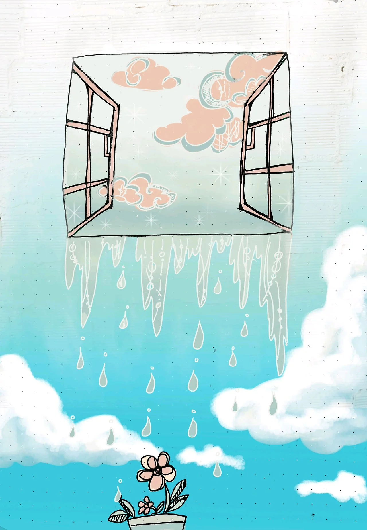 이건 최근에 올렸던 그림. 사실 배경의 구름보다 창 안의 비현실적인 이상한 구름이 더 맘에 든다.좋아하는 하늘 그림은 한 장면 안에 있는 두 개의 하늘이다. 한 그림 안에 흐림과 맑음, 밤과 낮, 노을과 새벽(사실 이 두 개는 나도 구분을 못 한다.) 혹은 그냥 대비되는 색의 하늘을 넣는다. 꼭 대비되지 않더라도 다른 시간대, 분위기의 하늘이 공존하는 그림을 좋아한다. 자주 쓰는 포인트는 창문, 문, 반사되는 물, 깨진 유리 등등이다. 사물이나 동물의 윤곽만 그려놓고 바깥과 안의 채색을 다르게 할 때도 있다.