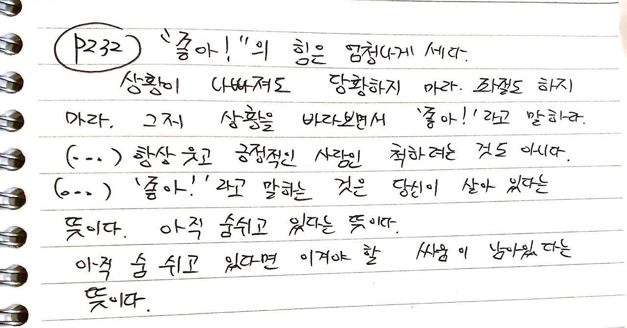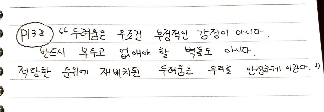 요즘 두려움에 빠져 허우적대고 있다. 내가 이 두려움을 잘 활용할 수 있을까? 아직 그 단계까지는 못 갔지만, 두려워한다고 무작정 나약하다면서 욕을 듣는 것보단 훨씬 위로가 되었다.