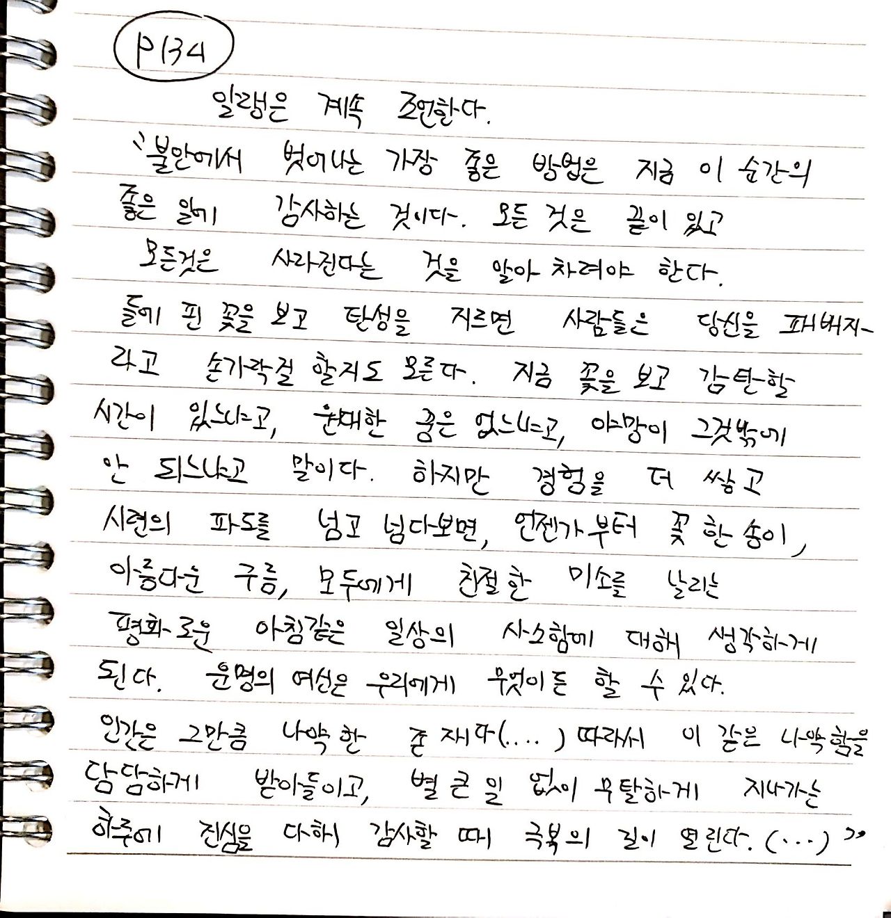 이 책은 너무 많은 말이 응축되어있다. 보시다시피 책갈피가 엄청 많다. 이북이 아니었더라면 이 책은 너덜너덜해졌을 것이다. 기분전환으로 읽을 책은 아니다. 굉장히 많은 이야기가 있으므로 자신의 상황에 맞고, 그날따라 끌리는 문장을 삶에 대입해보면 된다. 여기서 명상에 대한 많은 칭찬을 해 줬는데, 아직 나는 명상은 못 해 보았다. 그런데 주변 사람들의 명상 칭송(?)을 보면 곧 할 때가 된 것 같다. 요즘따라 싱숭생숭하니 마음도 복잡하고 앞날도 두려우니까.