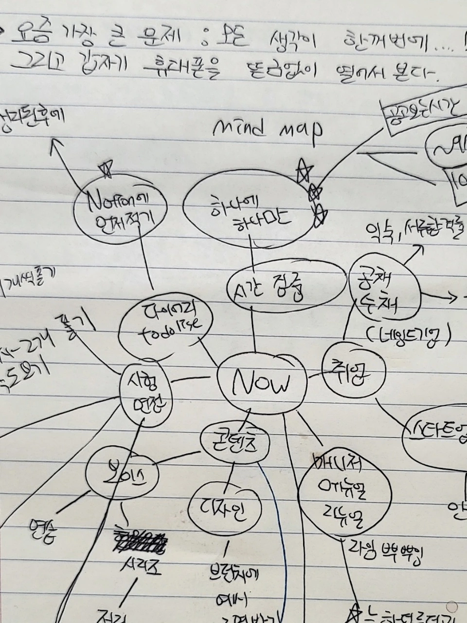 가장 먼저, 마인드맵으로 지금 해야 할 일들과 신경 쓰이는 일들, 앞으로 할 일들을 포함하여 생각나는 대로 정리해보았다. 정리하다 보니 나는 크게
