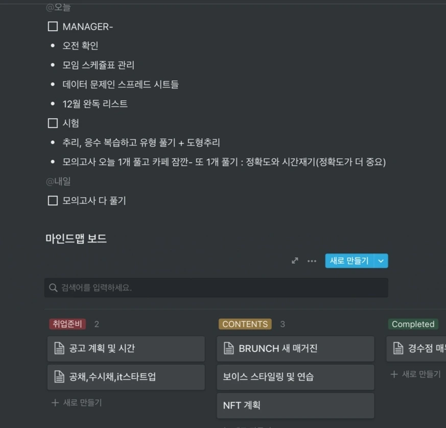 경수점 매니저를 하면서 노션을 아주 기가 막히게 사용하시는 피터님 옆에 있다 보니 서당개가 되어 풍월을 조금씩 읊고 있다. 덕분에 위와 같이 정리된 템플릿을 만들 수 있게 되었다. 일부만 가져온 거지만, 이를 통해서 남은 12월은 진짜 미친 듯이 살아볼 예정이다.