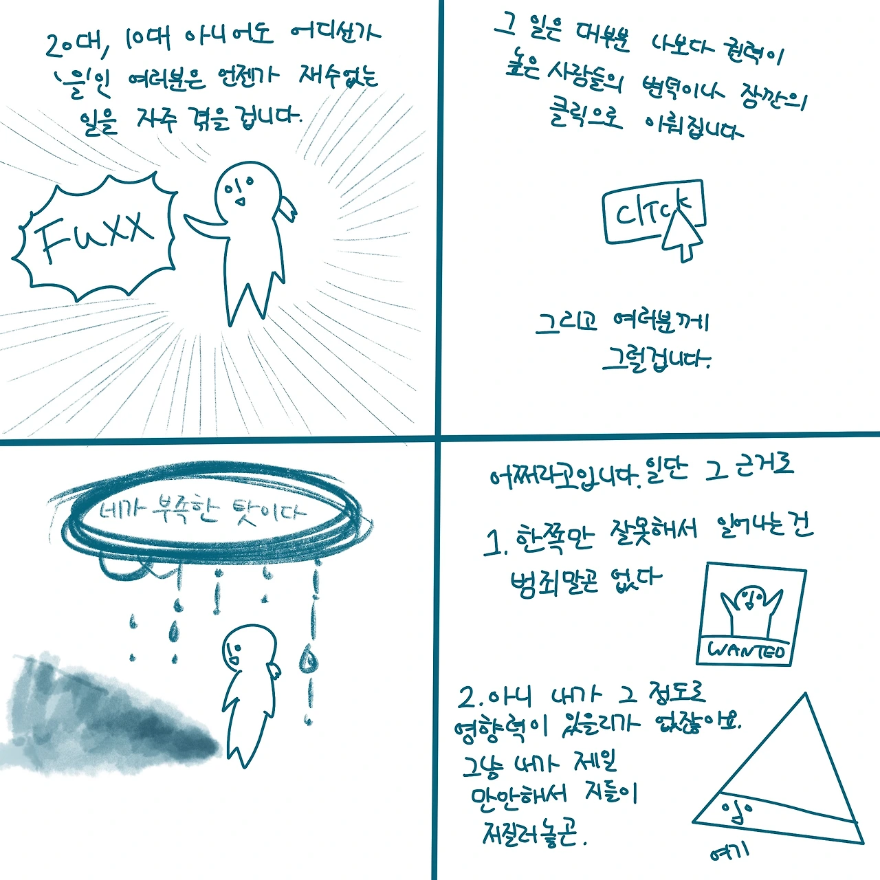 10대 20대 어쩌면 그 세대가 아니어도 을인 우리는, 분명 또다른 재수없는 일들을 겪을 것이다. 겪어오기도 했고, 앞으로 더 겪어야한다는 생각에 조금 슬퍼졌다. 이런 일들은 보통 나보다 권력이 있거나 경험치, 지위가 높은 사람들의 변덕 혹은 클릭 하나로 결정된다. 그럴때마다 내 인생의 주도권은 내가 아니라 그냥 나보다 운이 좋게 먼저 태어나서 자리 잡은 사람들에게 달려있는게 아닐까, 하는 생각이 든다.